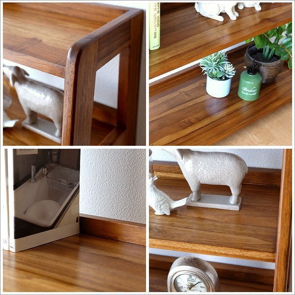 | 幅が90センチの横広タイプの 100%チーク無垢材のディスプレイラックは 木目が美しいモダンでスマートなデザイン 背面、側面に止め板があるのがポイントで 本やディスプレイしたアイテムが 落ちにくくなっています 天然木チーク材を使用したラックは 丈夫さや安定感に優れているので お気に入りの本やオーディオ機器、 インテリア小物などを たっぷり収納できるのが魅力です 商品名 : チークディスプレイラック90 商品番号 : wat0435 全体のサイズ(cm) : 幅90×奥行40×高さ128 棚板のサイズ : (上から) 幅86×奥行18 幅86×奥行21 幅86×奥行25.5 幅86×奥行30 幅86×奥行36 棚間の空間高さ : (上から)19.5/25/30/35 落下防止用の桟の高さ : 3 床からの空間高さ : 5 棚板の厚み : 2 材質 : チーク 重量 : 21kg 塗装 : シェラック 組立状態 : 完成品 生産国 : インドネシア ※床のキズ防止フェルトを貼ってお届けします ※天然木使用のため、木目や節など1本1本異なります ※こちらの商品は開梱設置【Dランク】となります |