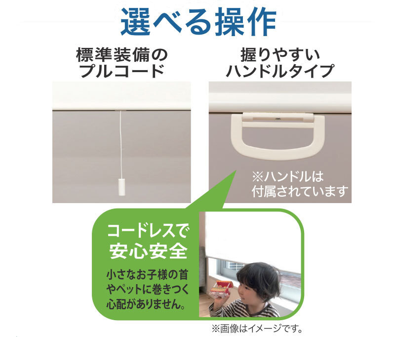 標準ロールスクリーンでついているプルコードと付属のハンドルからお好みの操作を選ぶことができます。
