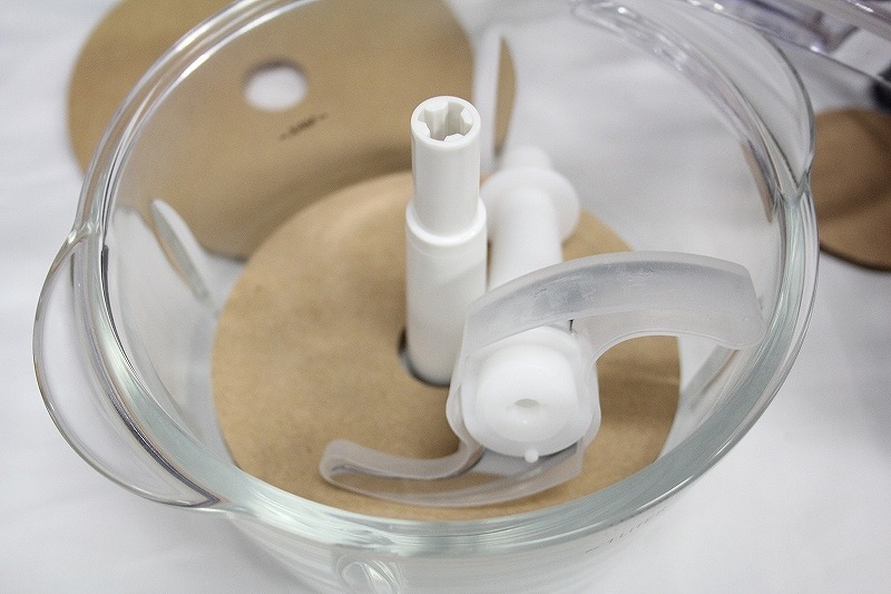 ボウルはガラス製、肉や魚のミンチを作ったときの油のヌメリ感をさっと洗い落とすことができます。