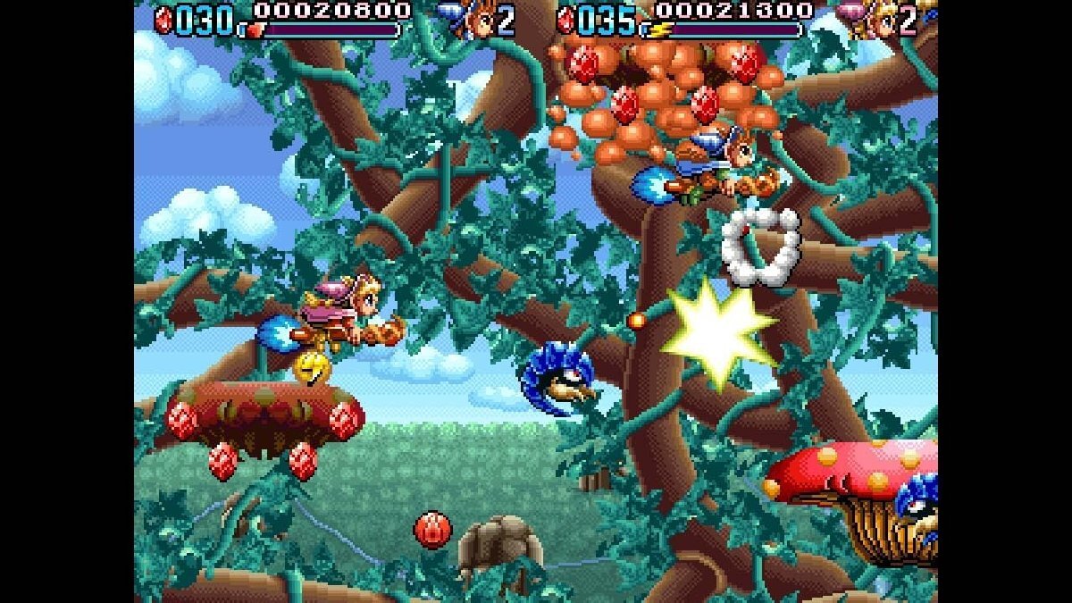 ・ホーキに跨った魔法使いをテーマにしており、カラフルで ポップで かわいいグラフィックと、明るい音楽で作られる世界観はアイレムのシューティングゲームでは珍しいですが、強力な魔法を撃つための「ため撃ち」や、方向入力と逆方向にホーキが飛び攻撃する「ホーキシュート」などの戦略性が高く、奥深いゲームデザインにはアイレムらしさが健在です。