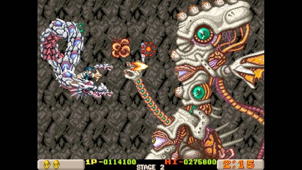 ・主人公は龍の背に乗り武器で攻撃したり、龍で体当たり攻撃をしたり、龍の長い体を巻き付けて敵の攻撃から主人公を防御したりと、状況に応じて攻撃も防御にもなるバハムートは、アイレムのシューティングの真骨頂と言え、プレイヤーがいつの間にか絆すら感じるようになるこのバハムートの存在こそが本作の最大の特徴となっています。