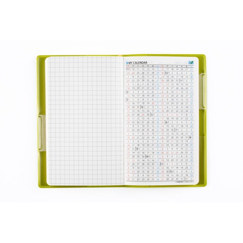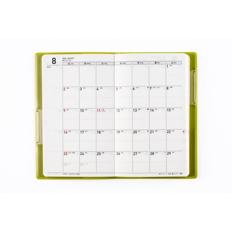 カバーはダブルペンホルダー付きで、2つのペンホルダーにペンを1本差し通せば、カバンの中でも手帳が開かず便利! 小さいサイズながら、切り取りメモなど充実の付録数です。