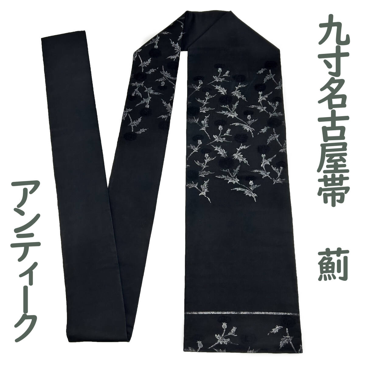 ★九寸名古屋帯 正絹 アンティーク 銀彩加工 薊 アザミ お太鼓柄 昭和中期 黒色 カジュアル 仕立て上がり 送料無料★