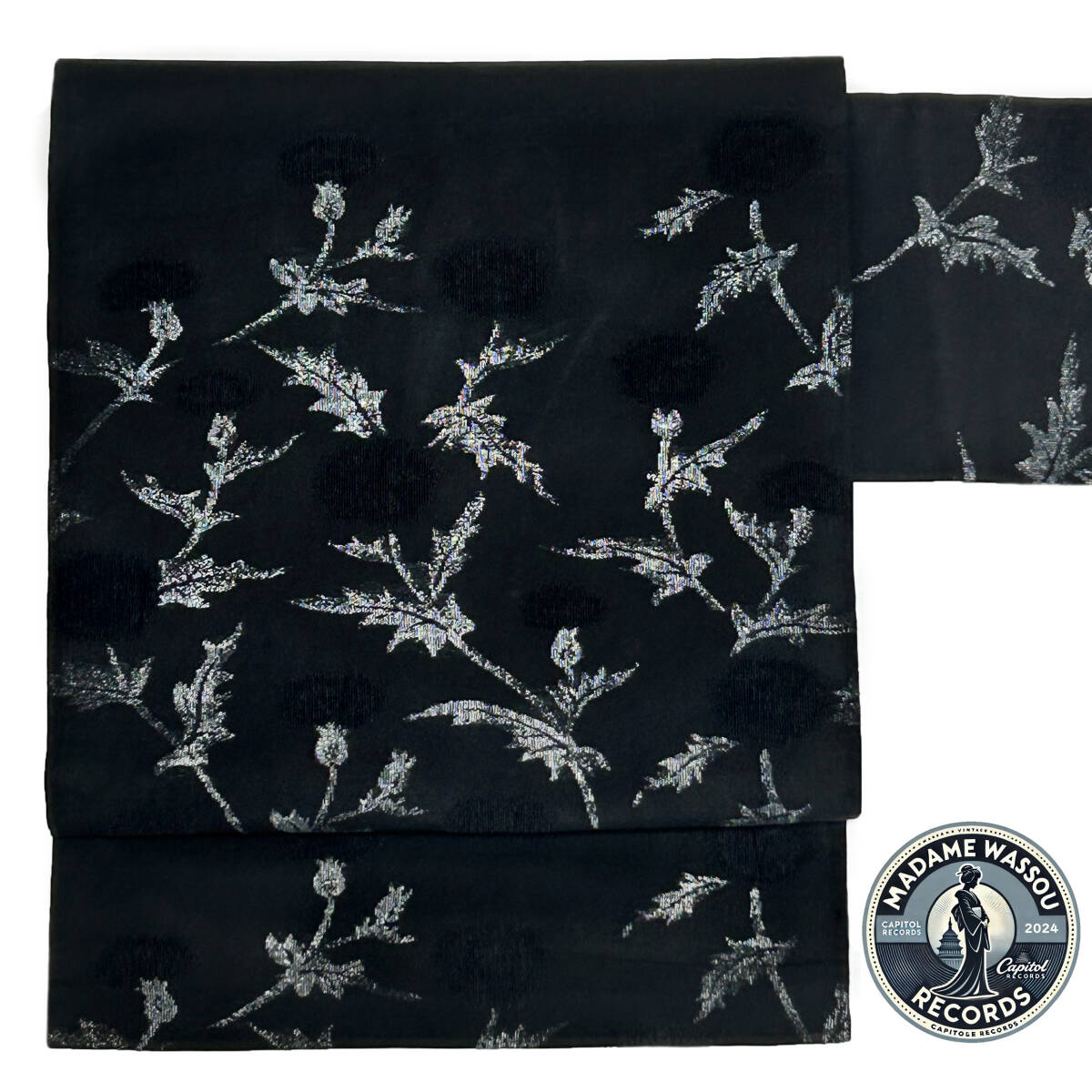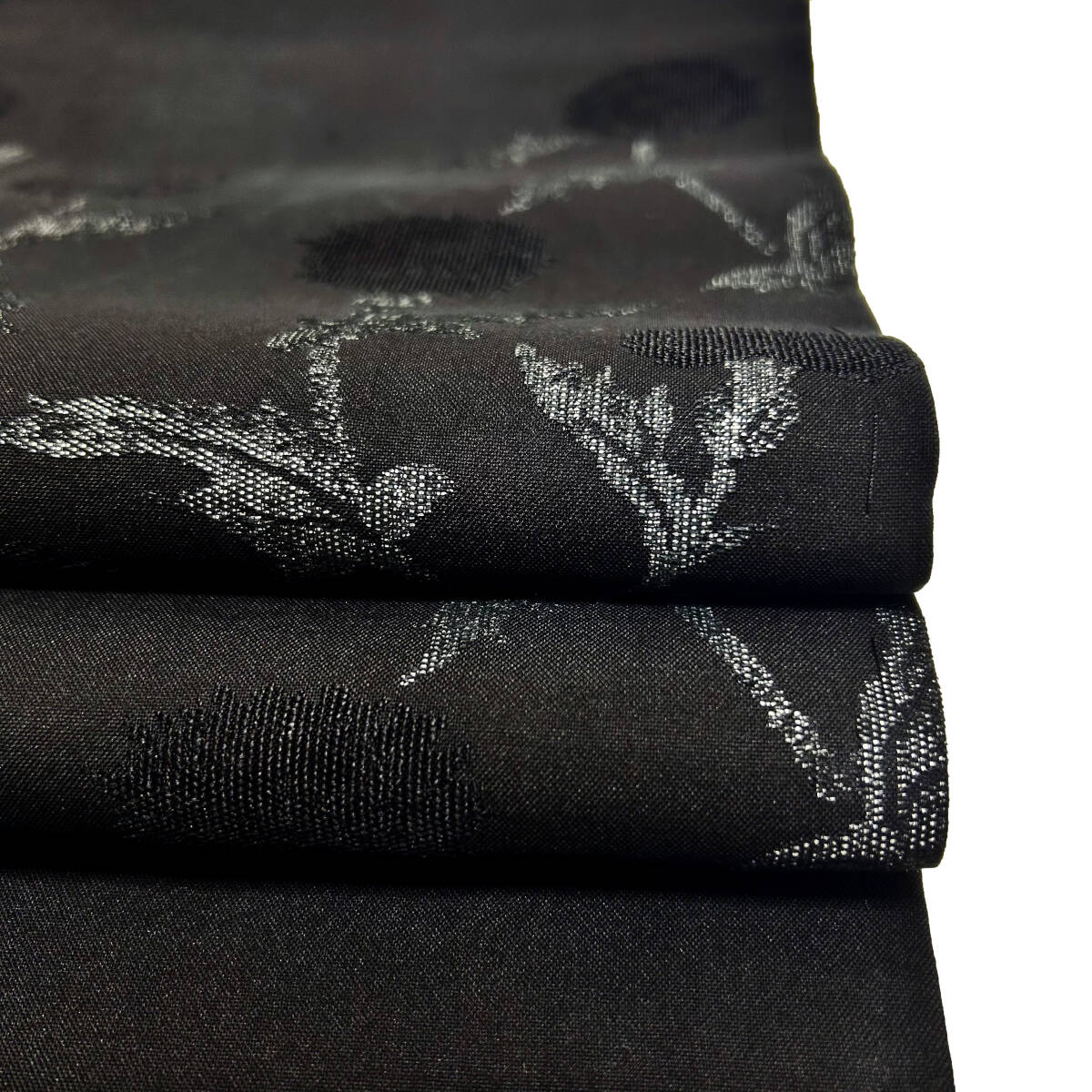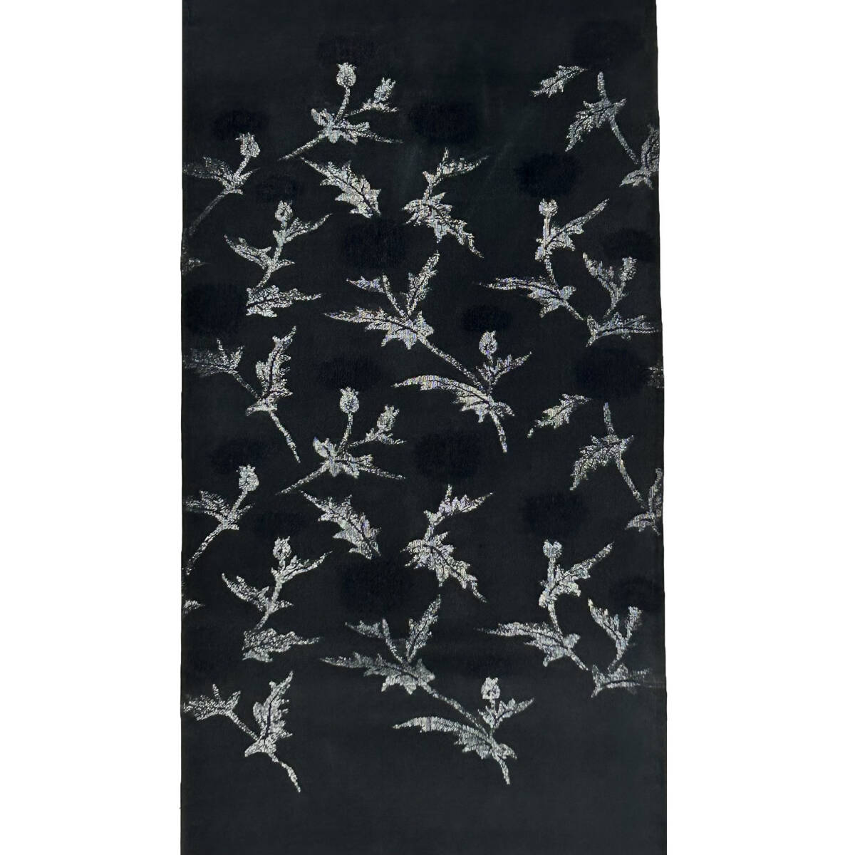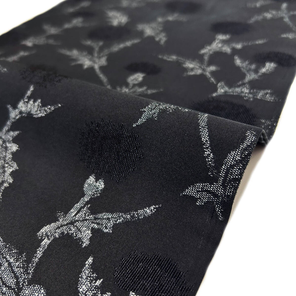 質感の良い黒色の地に、銀彩加工を用いながら薊の花以外の部分が織り出され、花の部分は地と同じ黒色でまるで地紋のように織り出された、非常に珍しい柄の描き方の九寸名古屋帯です。どうぞこの機会に是非ご検討下さい!