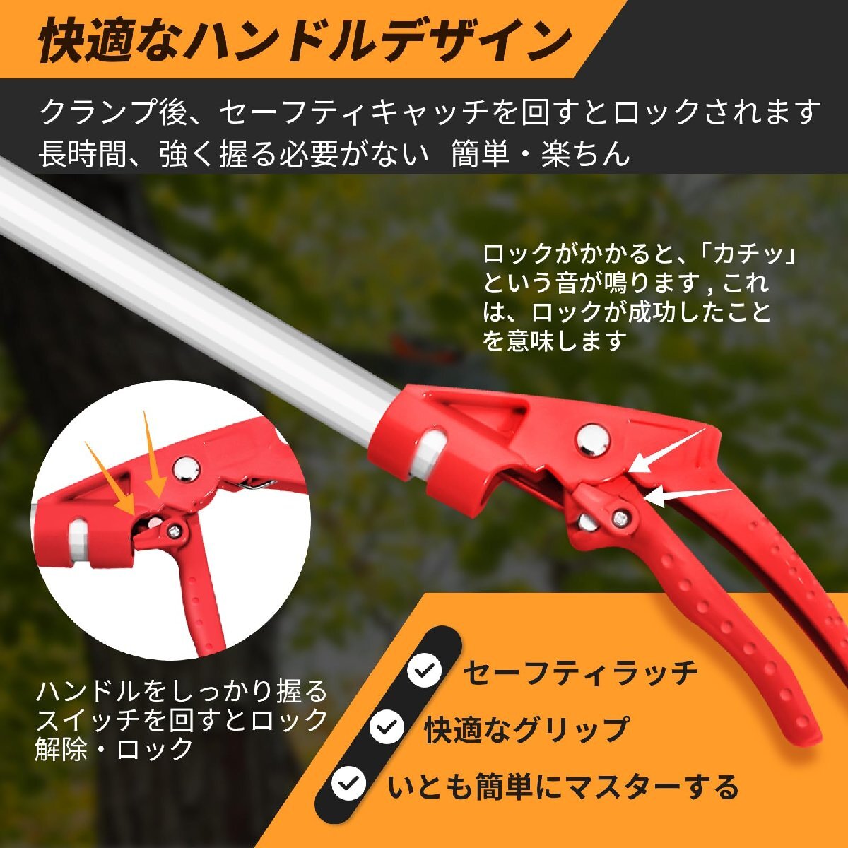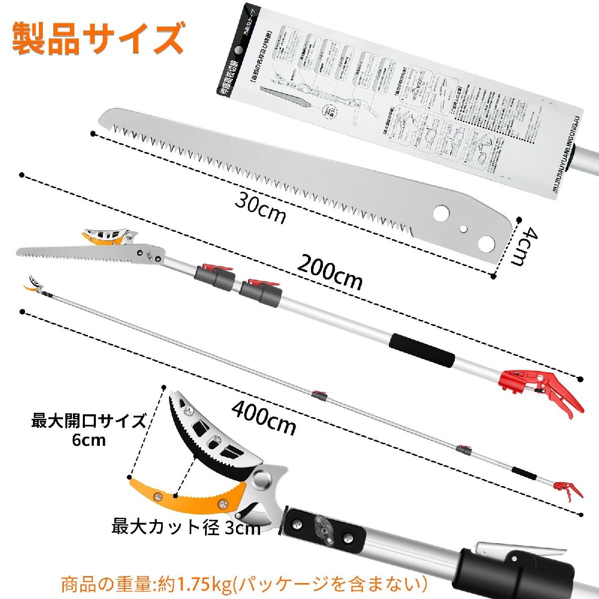 【省力化】高枝切鋏は物理的なてこの原理でドライブし、グリップが長くなるほど、より省力化になります。ABS材質のグリップは握り心地良く、滑り止めも付きでありながら、厚くグリップ設計はお客様の手には優しく、負担をかかりません。また、1.75kgの製品重量も持ち軽くて、女性の方にも簡単に使えます。三面研磨をしたノコ刃が付属しており、ノコ刃は自由に取り付けや外しが可能です。