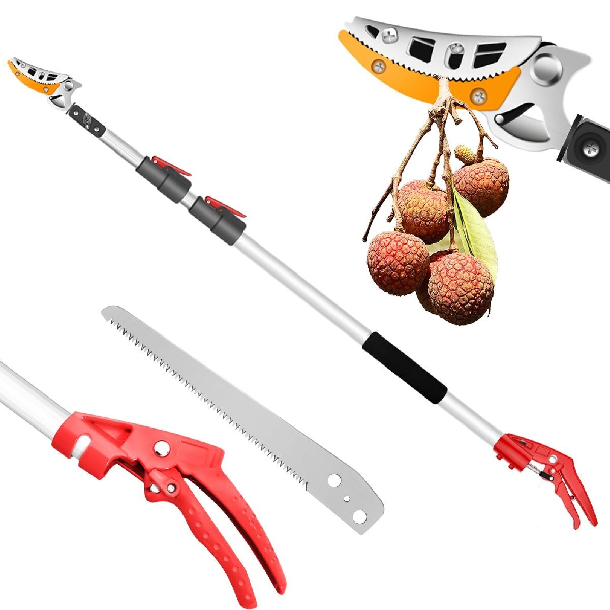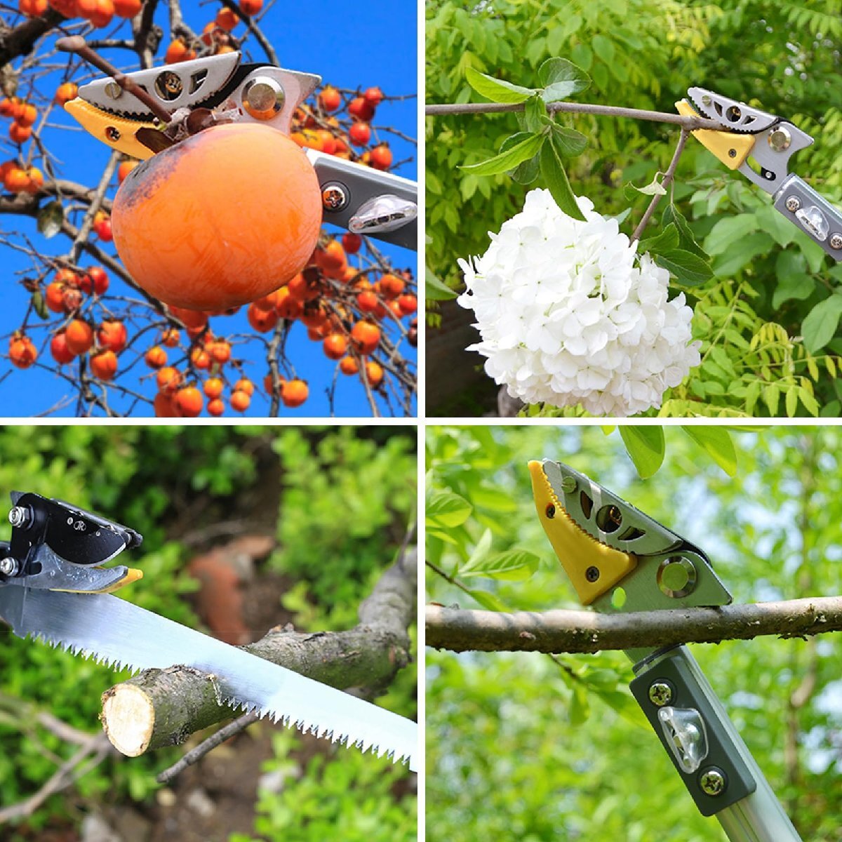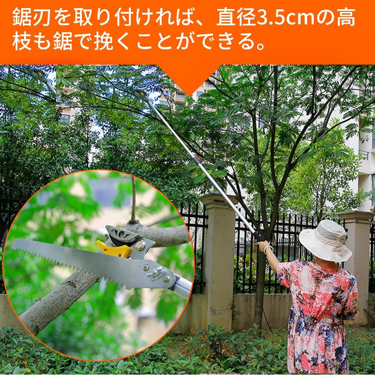 【切れ味抜群】この高枝切鋏のブレードは高精度な研磨が施しされ、鋭くて切れ味抜群です、弧状な刃先デザインはより簡単に太い枝をカットできます、波形固定の模様が設計され、よりしっかりと果物を固定できます。最大開け幅が15mmに達しています。大きい枝や太い枝にも適用、園芸、庭、花園、果樹などにも利用できます。適用シーンは非常に広いです。