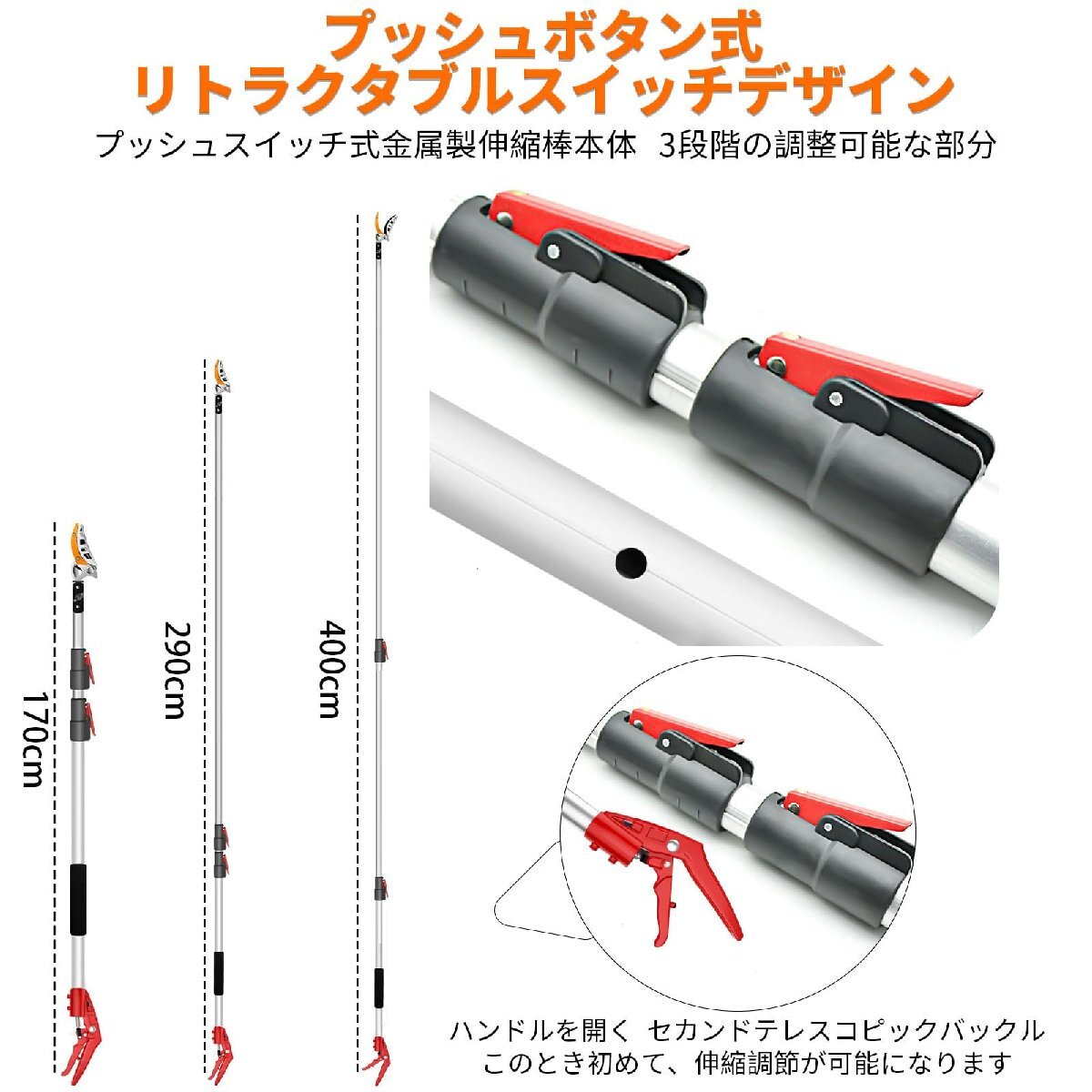 ブランド:Aredenカラー:シルバー【伸縮可能なグリップ】高枝切鋏のグリップは三段式に伸縮でき、170cm~400cmの範囲で自由に調整できます。高い枝や樹木をカットする場合、階段登りは不要で、安全安心でハサミを使えます。また、調整装置が二つ付きましており、三段式でグリップを自由に伸縮できます。クリップで安全ロックが付き、刃先を閉じることができます。