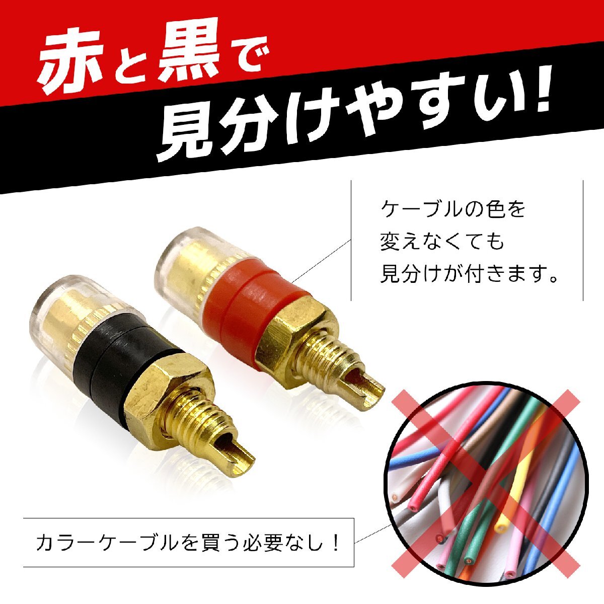 • プラグはレッド(赤)とブラック(黒)の2色セットのため配線の識別が一目で可能。