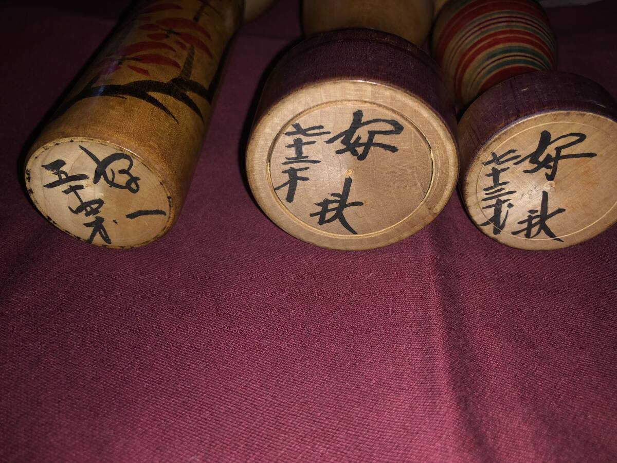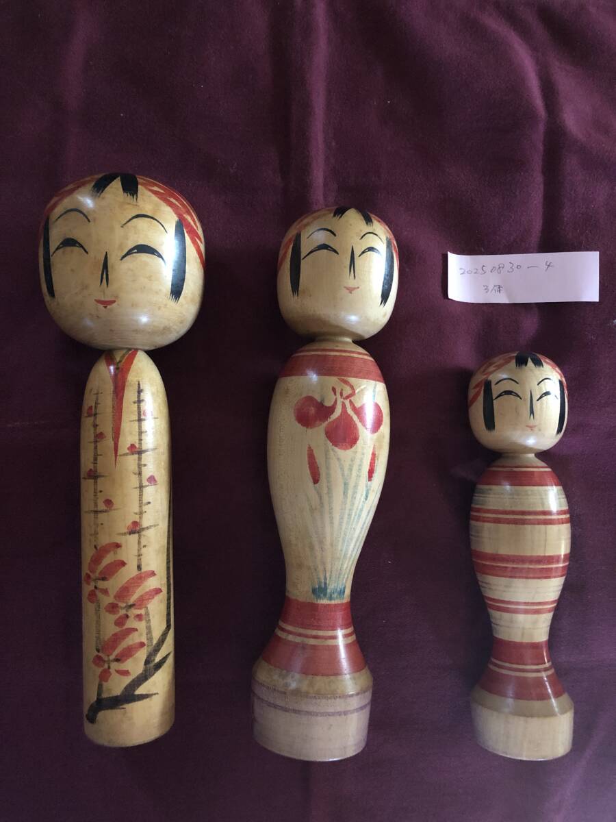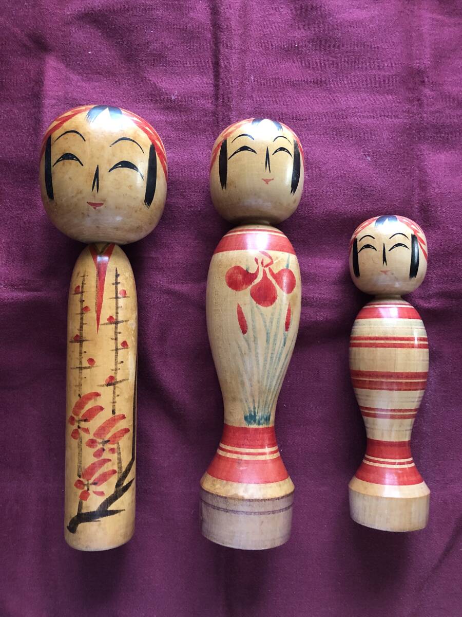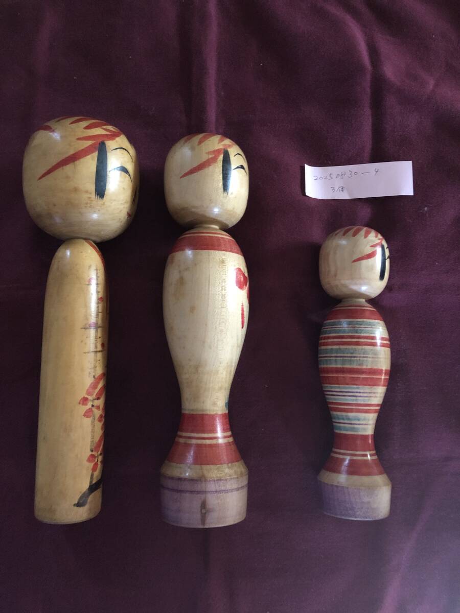 ご覧いただき、誠に有難うございます。佐藤好一 さん(遠刈田系)とその父親で師匠でもある佐藤好秋さんの作品です。1970年代の中ごろ以降に買い求められたものです。古いものですので、汚れや擦れ、焼けなどもあります。大きいものから順番に高さ25㎝、24㎝、18㎝程度の大きさです。写真を参考にしてください。