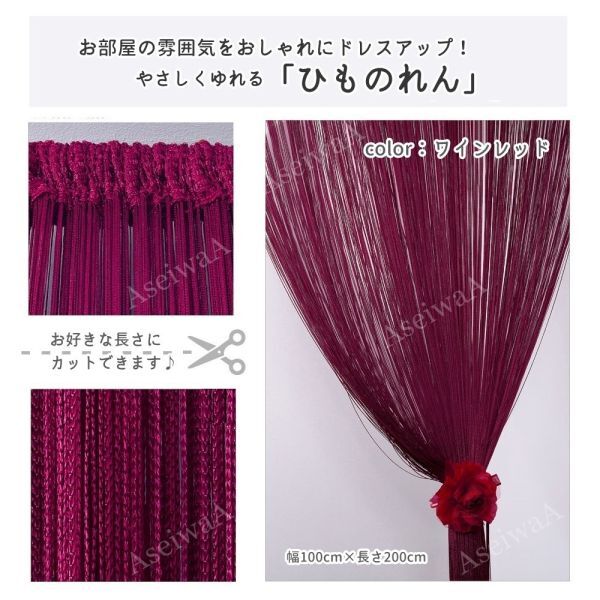 特徴 | ・優しくゆれる「ひものれん」で、お部屋の雰囲気を変えてみませんか。 ・豊富なカラーラインナップで、自分好みの部屋にカスタマイズ可能! ・目隠しや、お部屋の間仕切りにもオススメ♪ ・ハサミでカットしても、ほどけたり糸が飛び出したりすることがありませんので、お好きな長さにカットすることができます。 ・ひものれんの上部は袋縫いになっているので、つっぱり棒やワイヤーに通して簡単に取り付けることが可能です。 ・お部屋だけではなく、お店やレストラン・カフェなどの非日常的なムードあふれるお洒落な空間作りにも大活躍♪ |