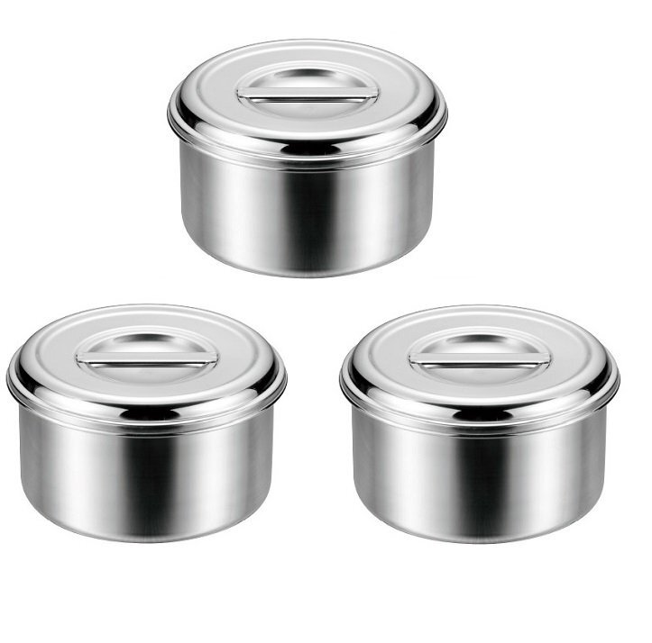 ☆キッチンポット浅型10cm(容量約0.5L)3個引掛金具付蓋の置き場に困らない引掛金具付の蓋ですステンレス18-8日本製新品