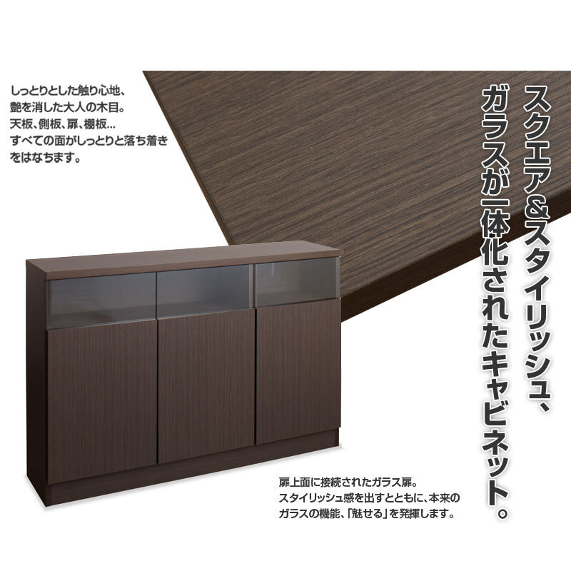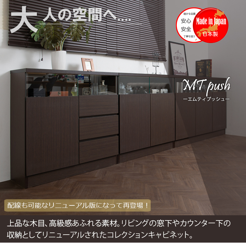 ■シリーズが配線も可能なリニューアル版になって再登場!リビングに置いても、圧迫感も無く広さを感じさせてくれる。ガラス部分はディスプレイスペースに、リビングがコレクションルームに!?奥行29.5cmの薄型設計で、カウンター下にも収まる高さ80cm♪お皿やキッチンのアイテムを隠す・見せる収納。グラスなどは、ガラス部分の収納部に飾っておしゃれに♪カウンター下が造り付けの食器収納に、すっきりとおしゃれなキャビネットシリーズで、キッチンルームがすっきりと片付きます。扉上面に接続されたガラス扉は、スタイリッシュ感を出すとともに、本来のガラスの機能、「魅せる」を発揮します。手掛けを無くし、プッシュ式扉を採用!すっきりとしたデザインで、押すだけでスムーズに開閉します。最近、リビングやカウンター下などでも配線が必要なケースが多くなってきているため、コード穴や棚板の後ろに1cm隙間を設けて、配線がしやすく、ルーター等や隠したい機器の収納も、最適にお使い頂ける仕様にリニューアル致しました。背面にはコード穴も完備。棚板をセッティングする受け金具は、安全面が考えられた特殊な金具で、棚板をセッティングするとしっかりと固定されます。もちろん、高さ調節も簡単にできます。本・ビデオ・DVDや、コレクション、食器類どのジャンルでもこなせる収納棚。可動式で、3段階の調節が可能。リビングでもキッチンでもしっかりと収納できる万能型キャビネットです。