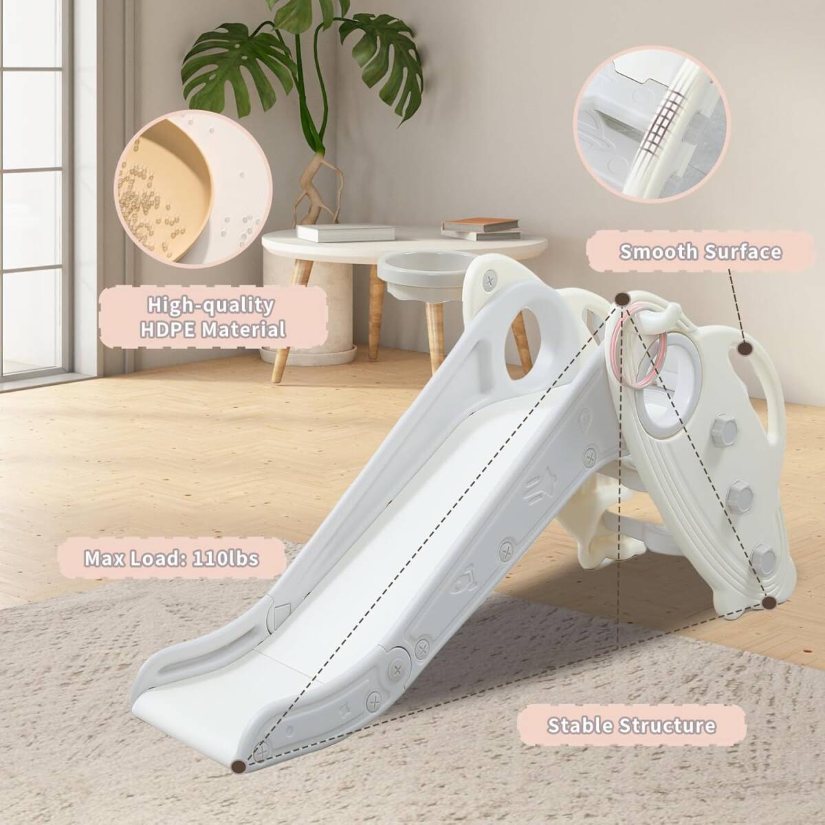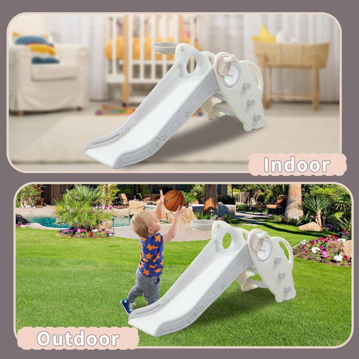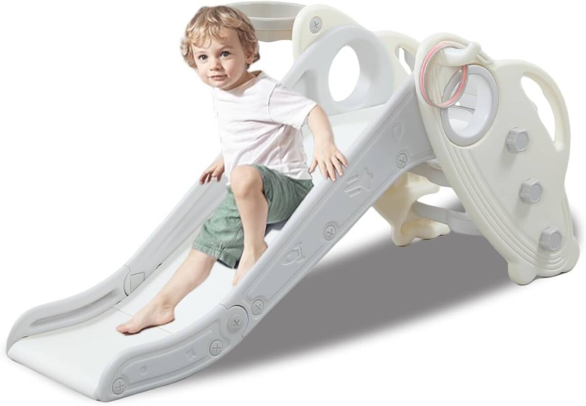 【多機能プレイセットで無限の楽しさ】この子供用スライドは、滑るだけでなく、バスケットボールフープやリングトスゲーム、登る機会を統合しています。屋内外での使用に最適で、幼児の創造性とアクティブな遊びを刺激する安全で楽しい遊び場を提供します。