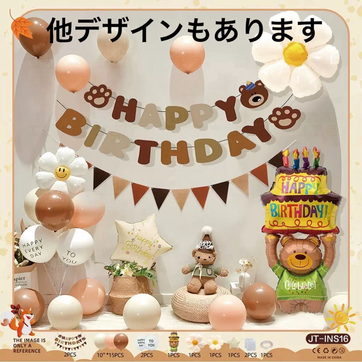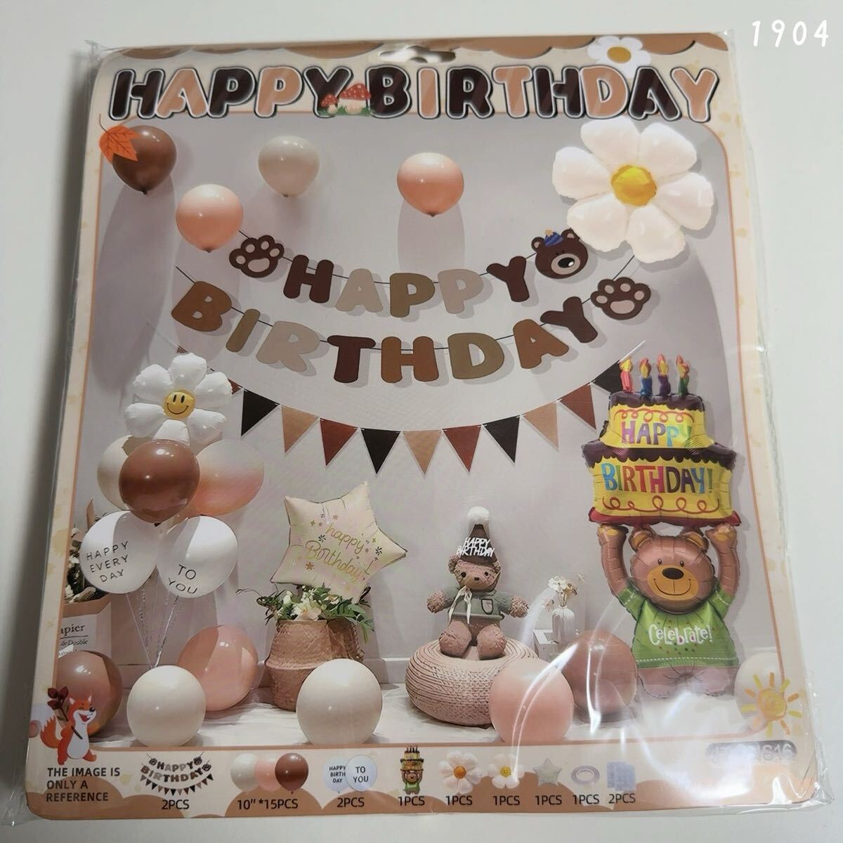 クマとケーキのバルーンが主役の、ブラウン系で統一されたナチュラル可愛い誕生日飾り付けセットです。