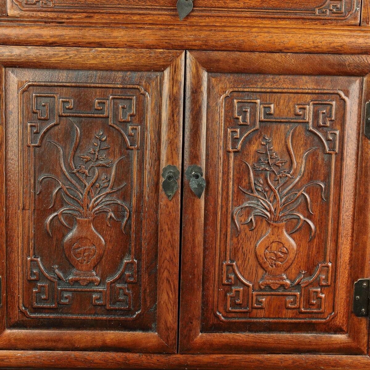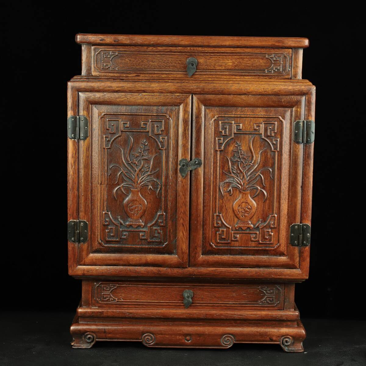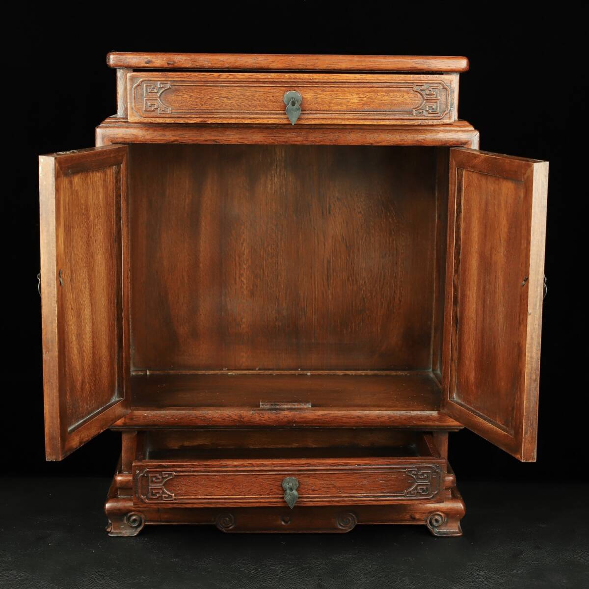 旧 清代 花梨木 彫刻 対扉 上下引き出し 収納棚 中国古美術 古賞物 古置物 唐物 S78