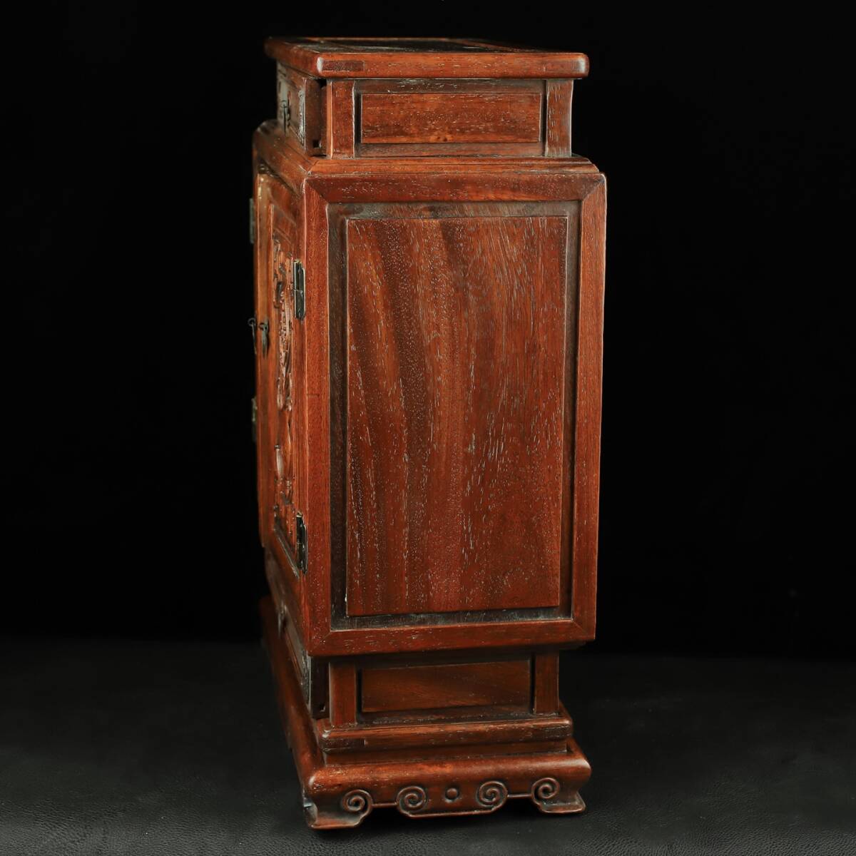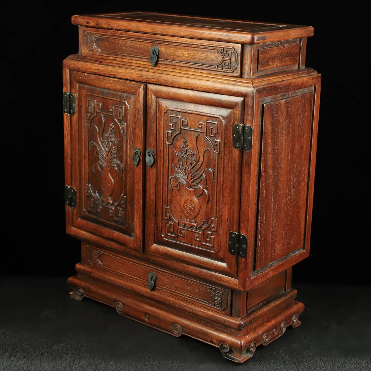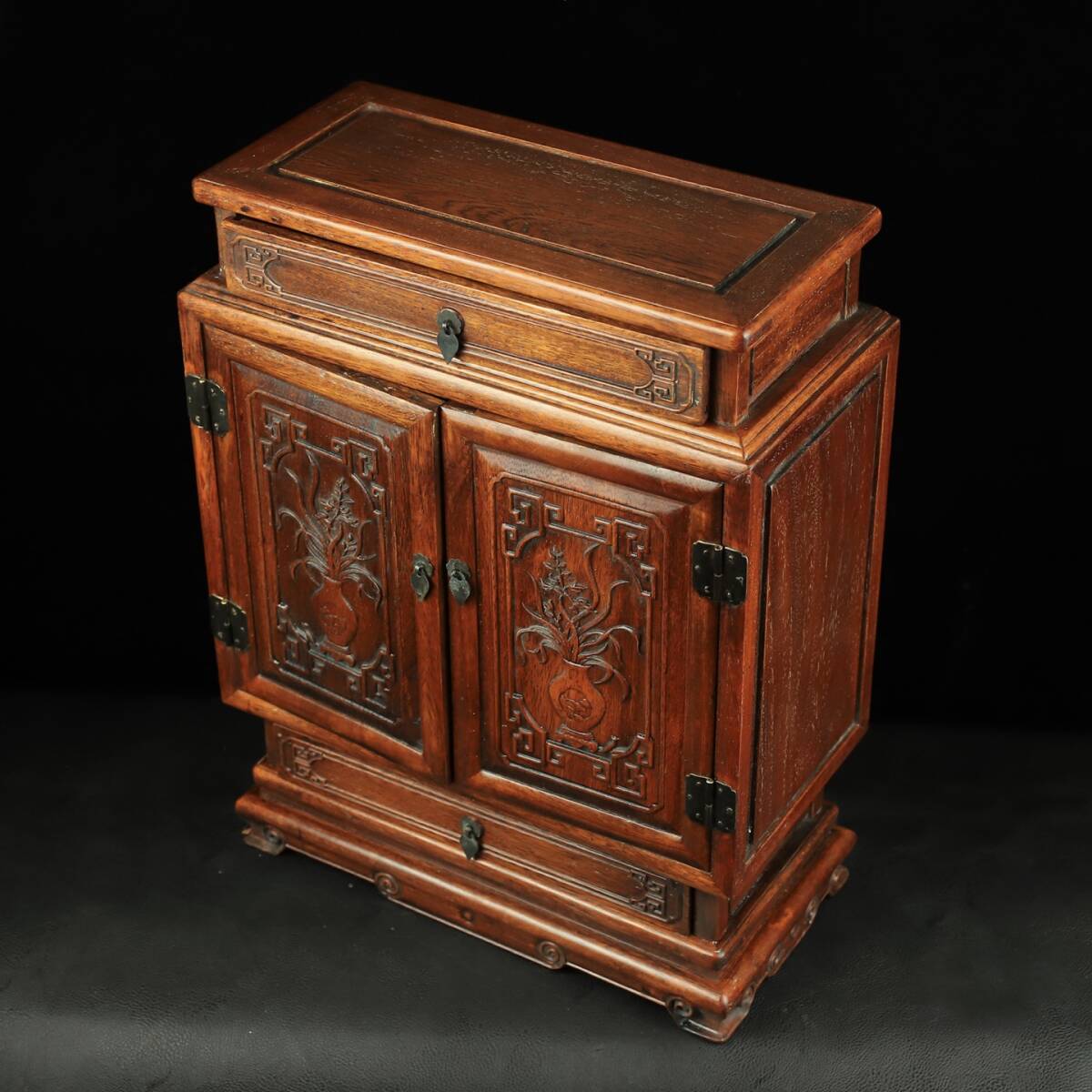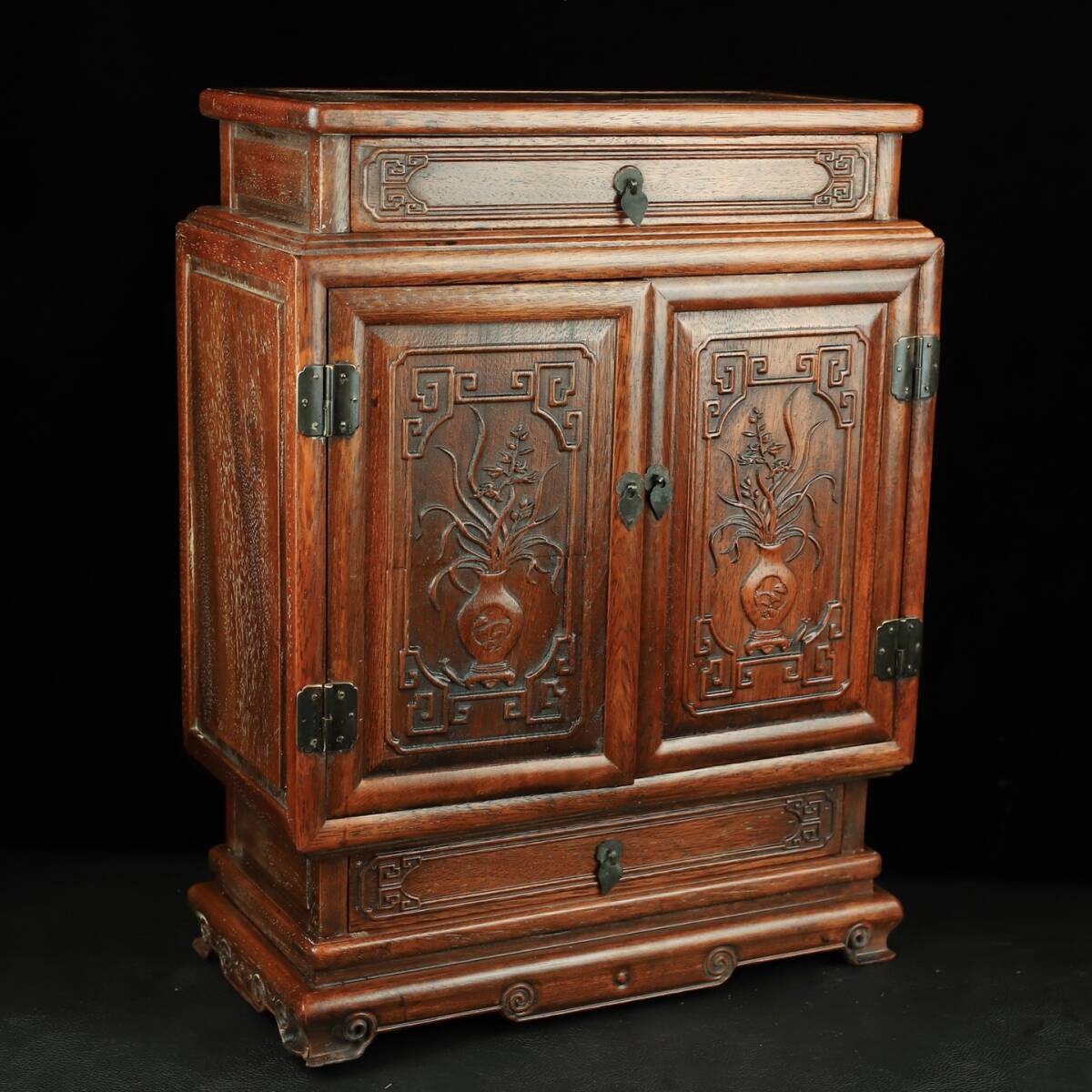 旧 清代 花梨木 彫刻 対扉 上下引き出し 収納棚 中国古美術 古賞物 古置物 唐物 S78