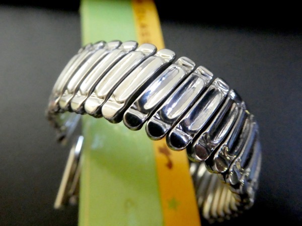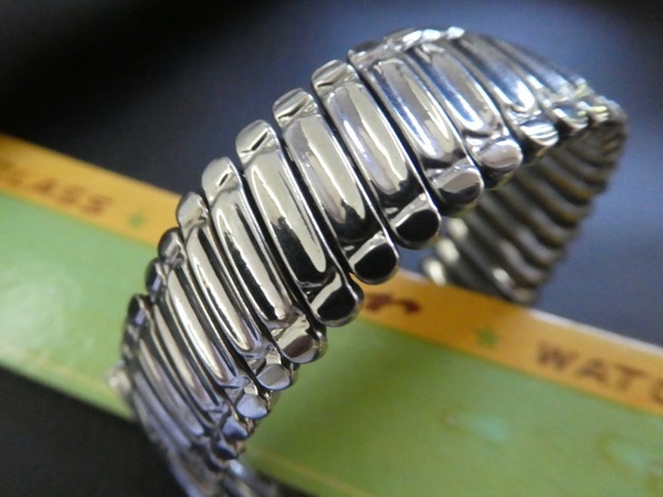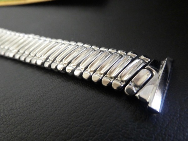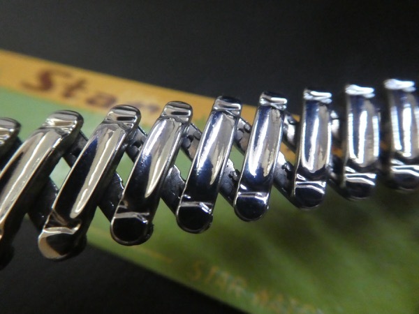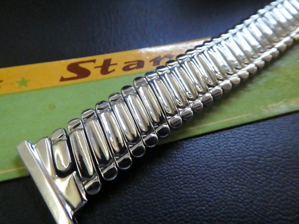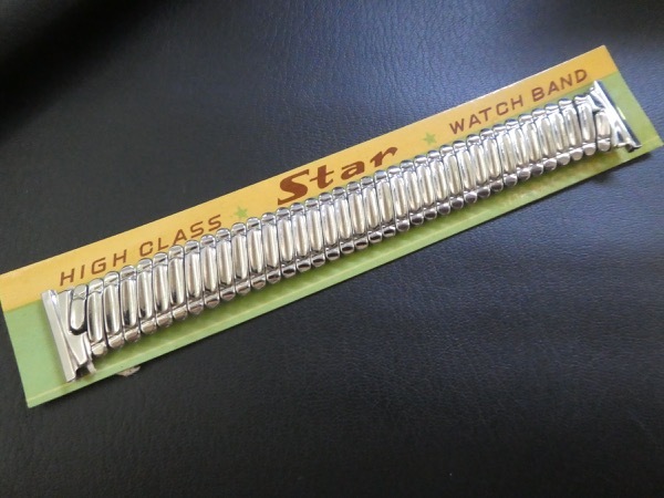 vintageSTAR伸縮エクステンションバンド銀色未使用です。台紙はSTAR、本体にはROYAL STARの表記。長さ約13.2センチ、取り付け幅約19.16ミリ(加工により幅調整するタイプ)です。バンド本体幅は約15.39ミリ。古い時代のデッドストック品ですので保管時のよごれキズ、経年劣化など多少はありますのでご容赦願います。