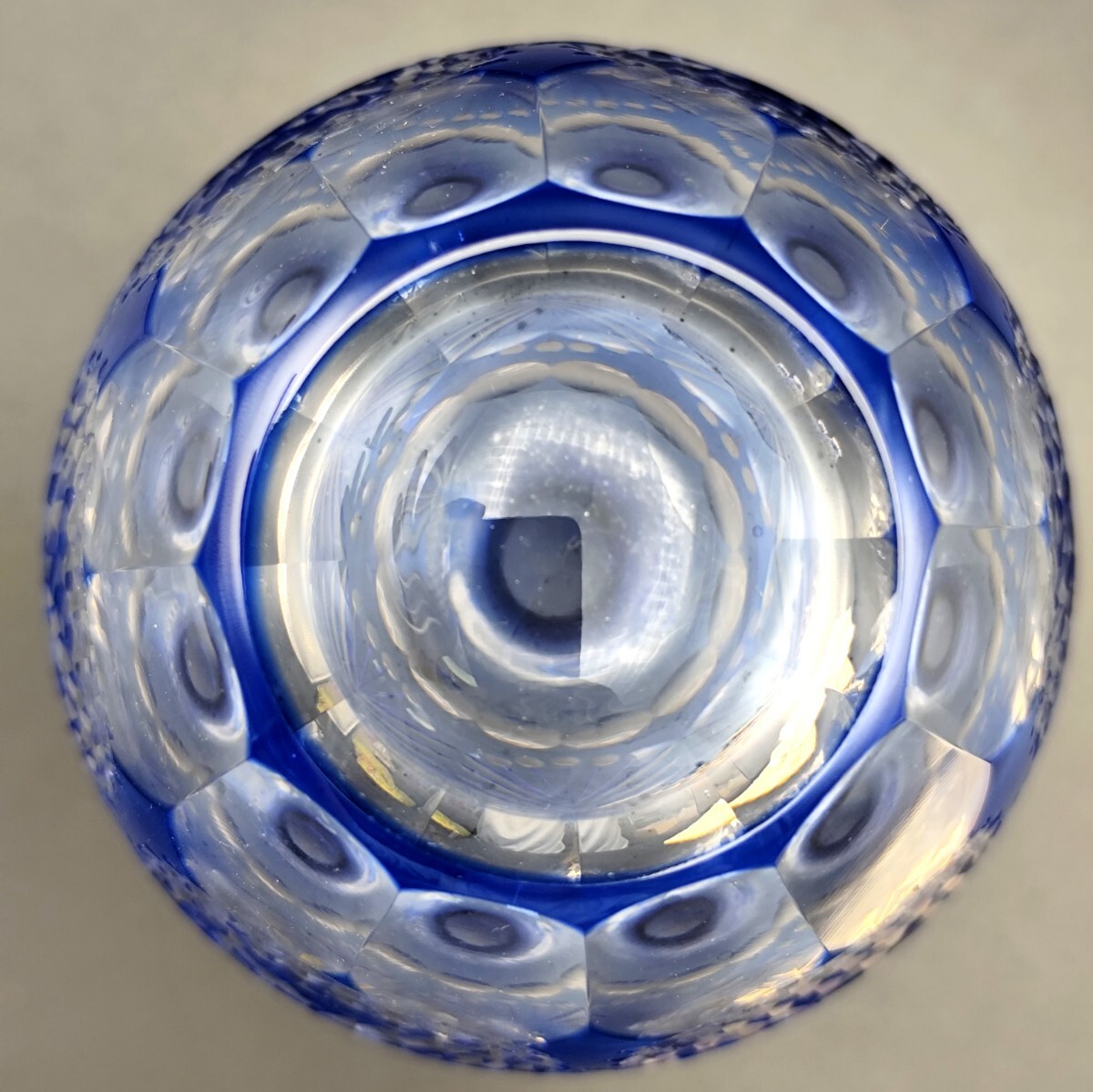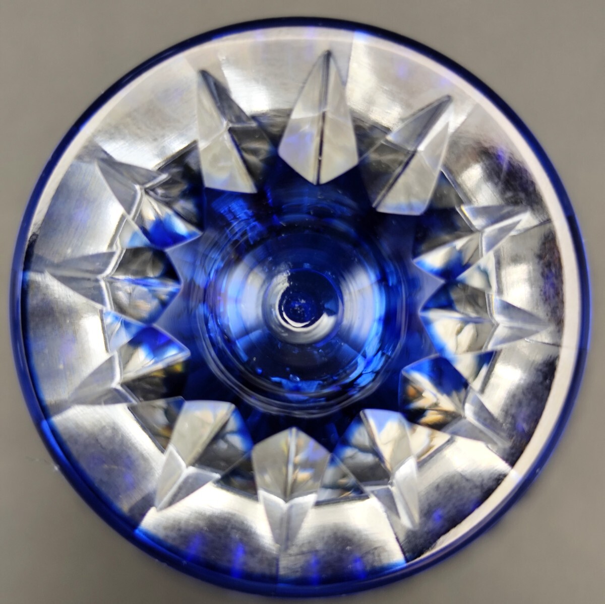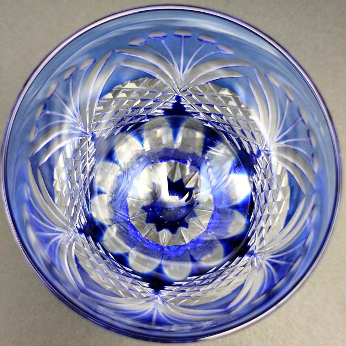 透明感あふれる青被せガラスに、精緻で美しいカットが施された逸品。