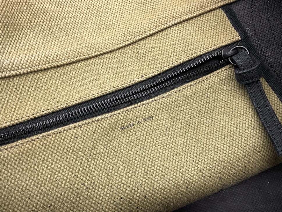 【素材】:キャンバス素材(72%)に、28%のカーフスキンの組み合わせ