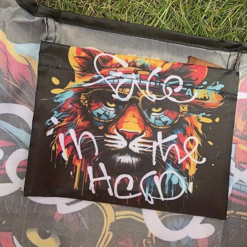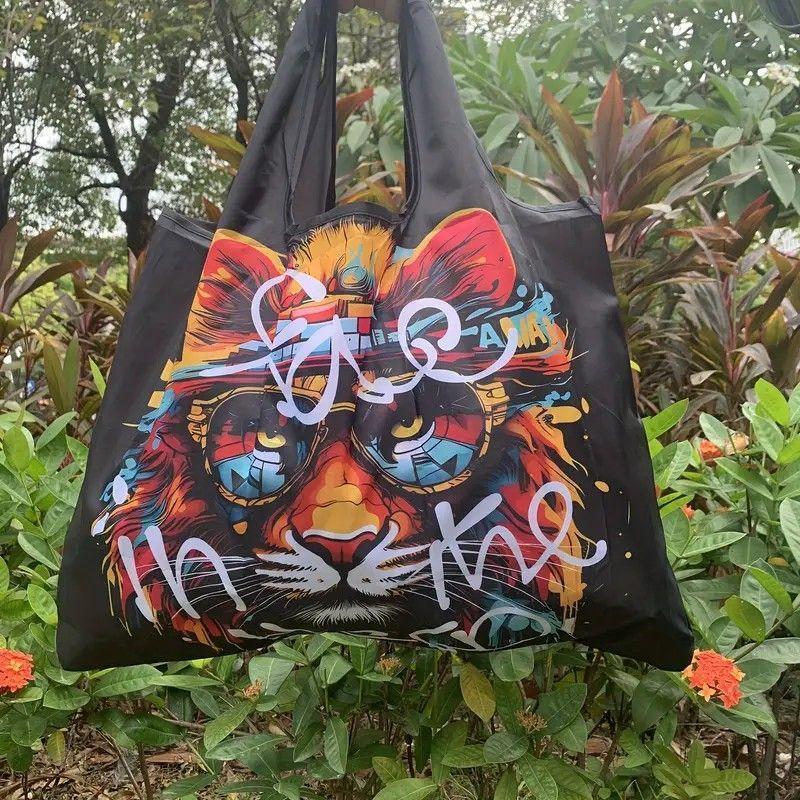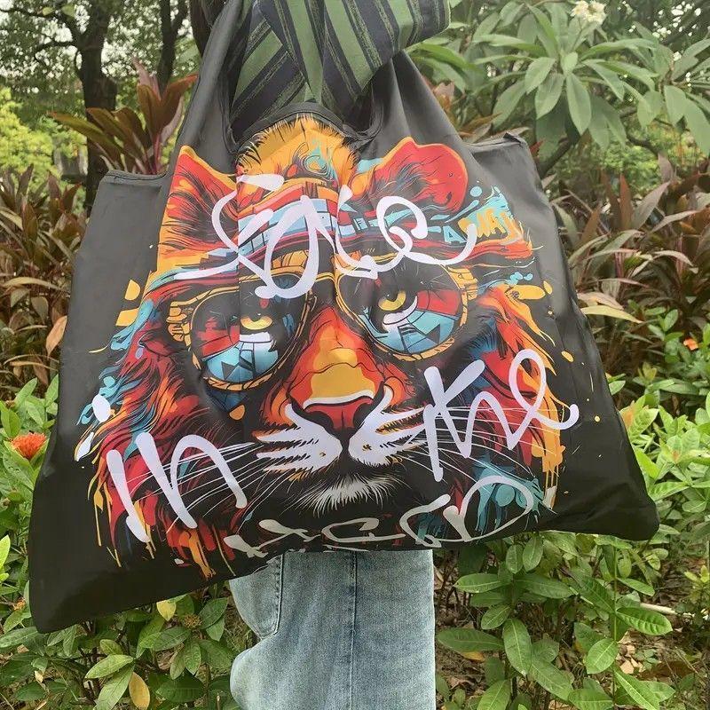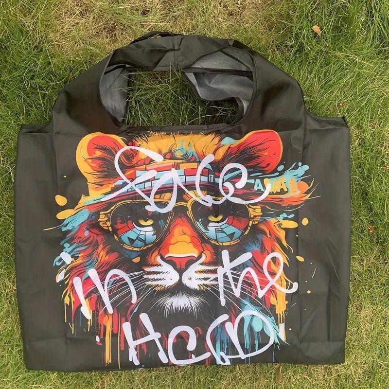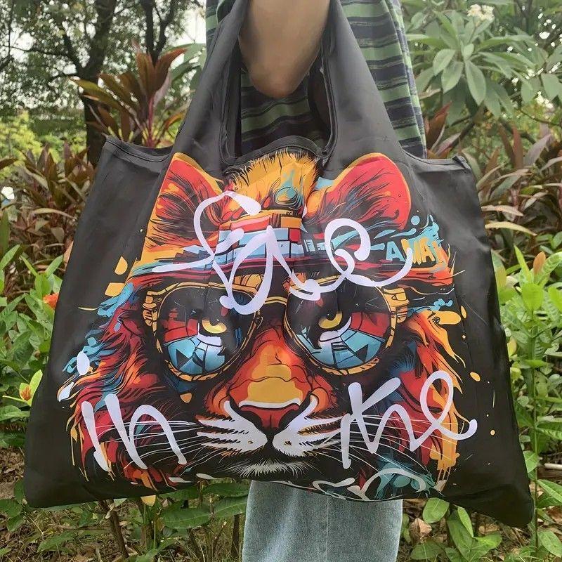 ユニークな猫デザインと「BE IN YOUR OWN」プリントがポイントの、大型ナイロントートバッグ。