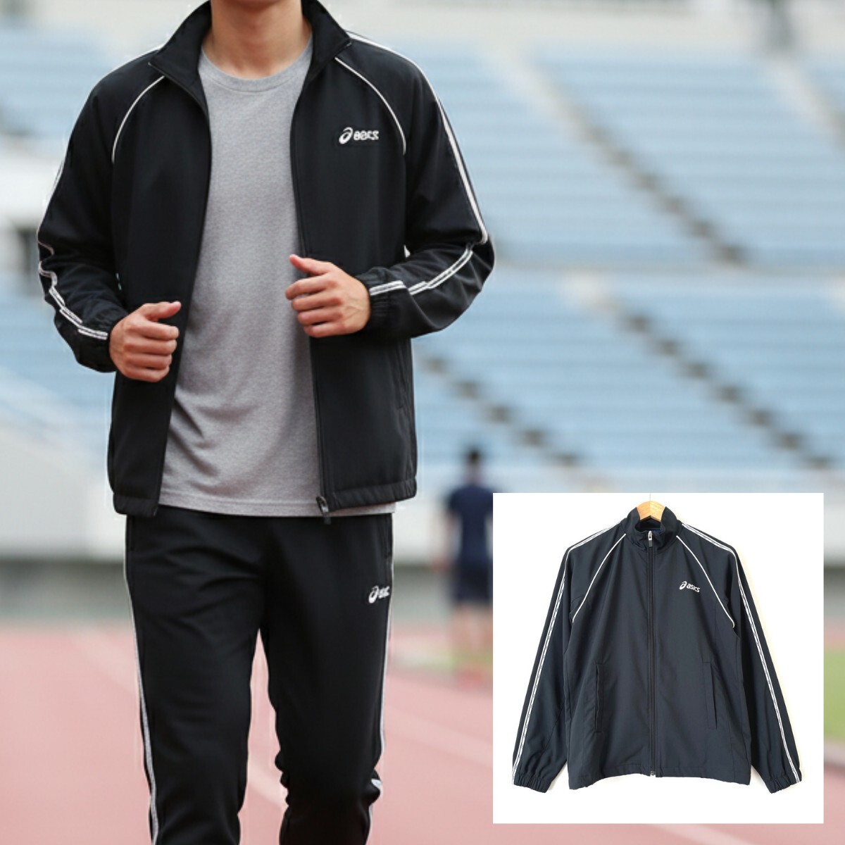 asicsのトラックジャケットでし。サラっとした生地感で快適な着心地◎スポーツ全般にぴったりです。デザインも良くファッションアイテムとしてもオススメ!状態も良好です◎