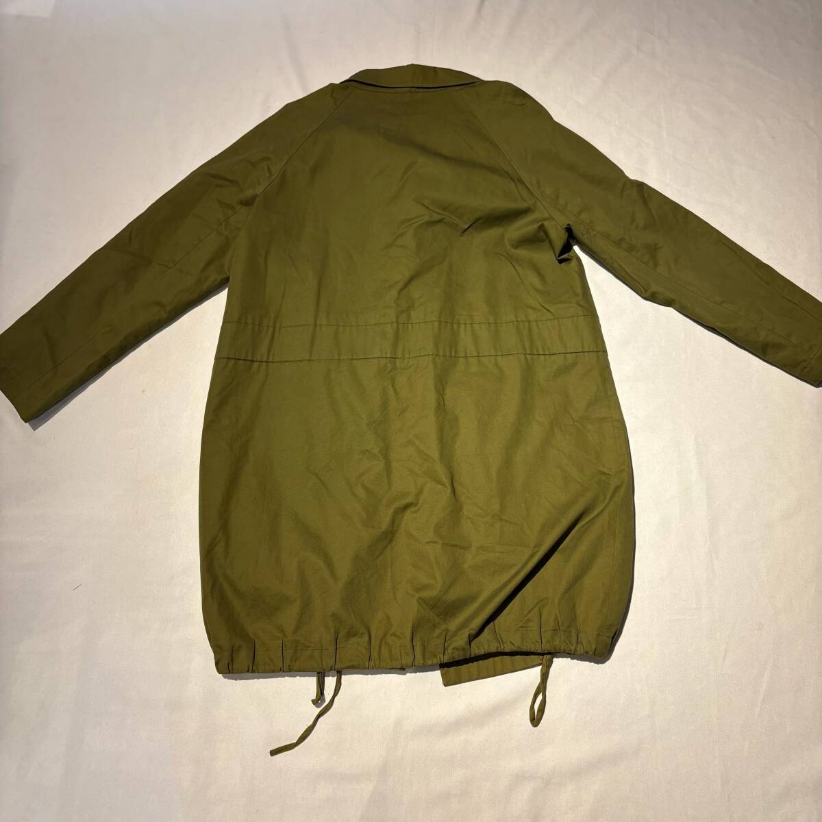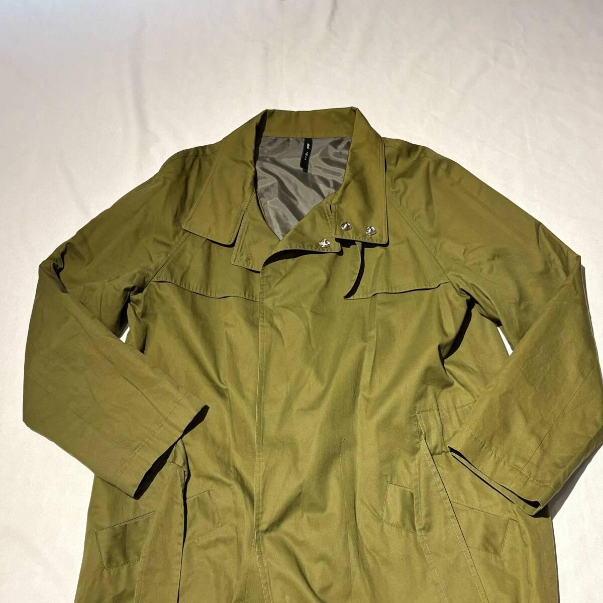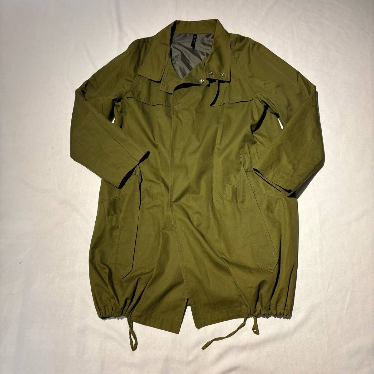 ウエストのベルト、裾のドローコード、襟元のボタンなど機能が多いコートです。