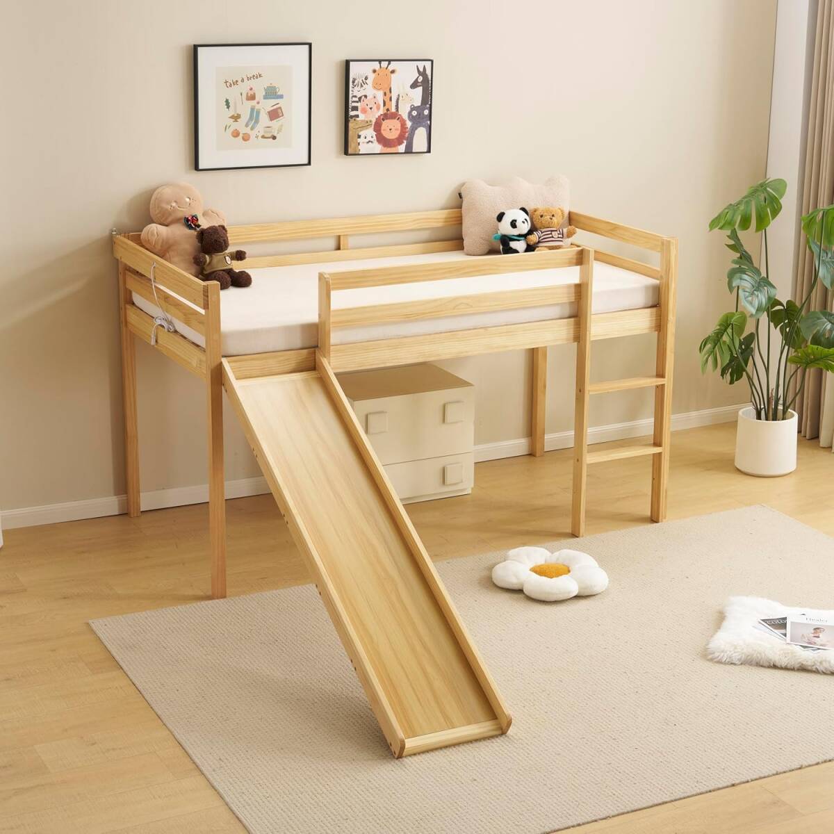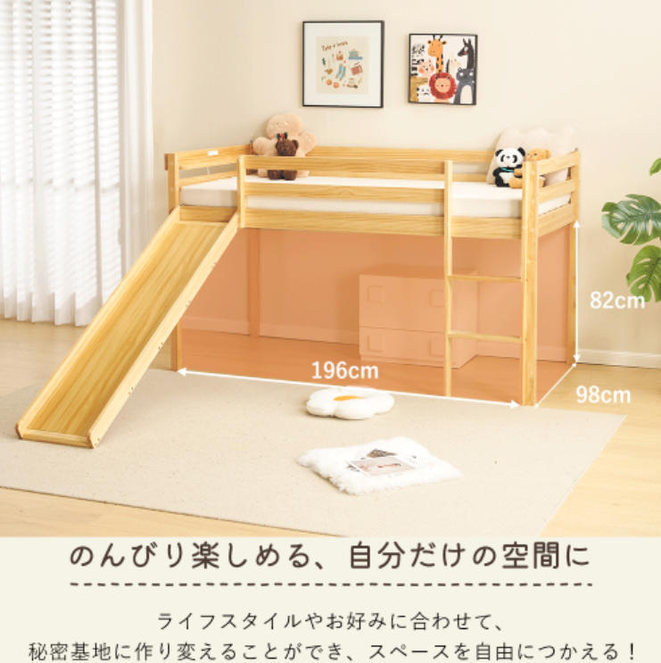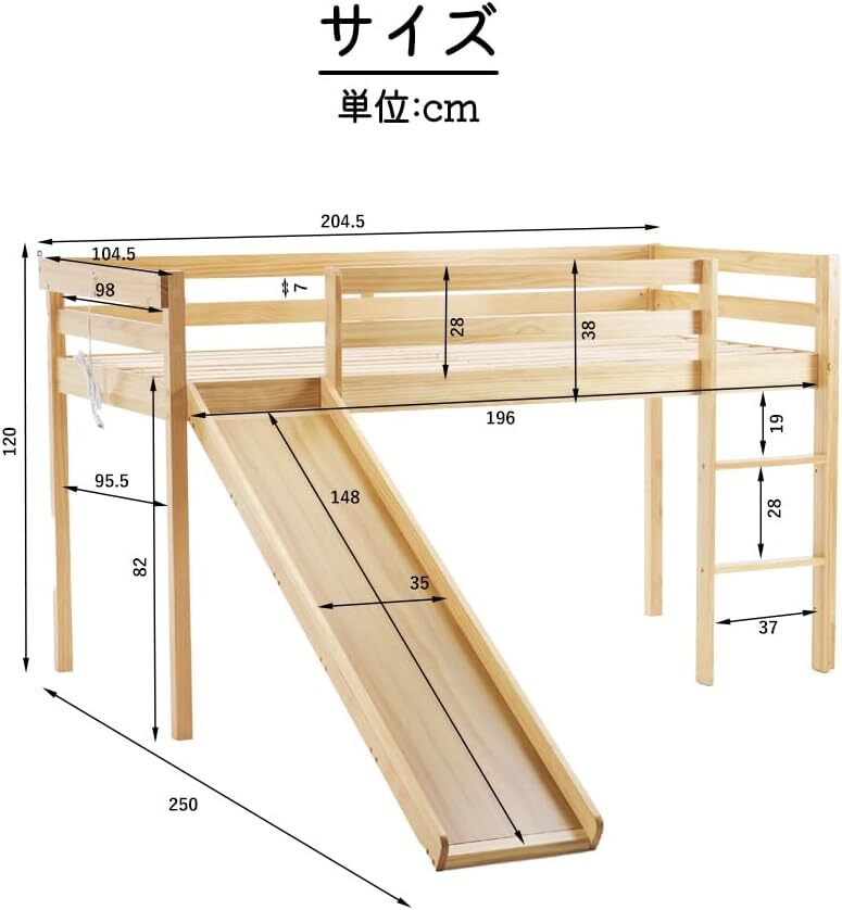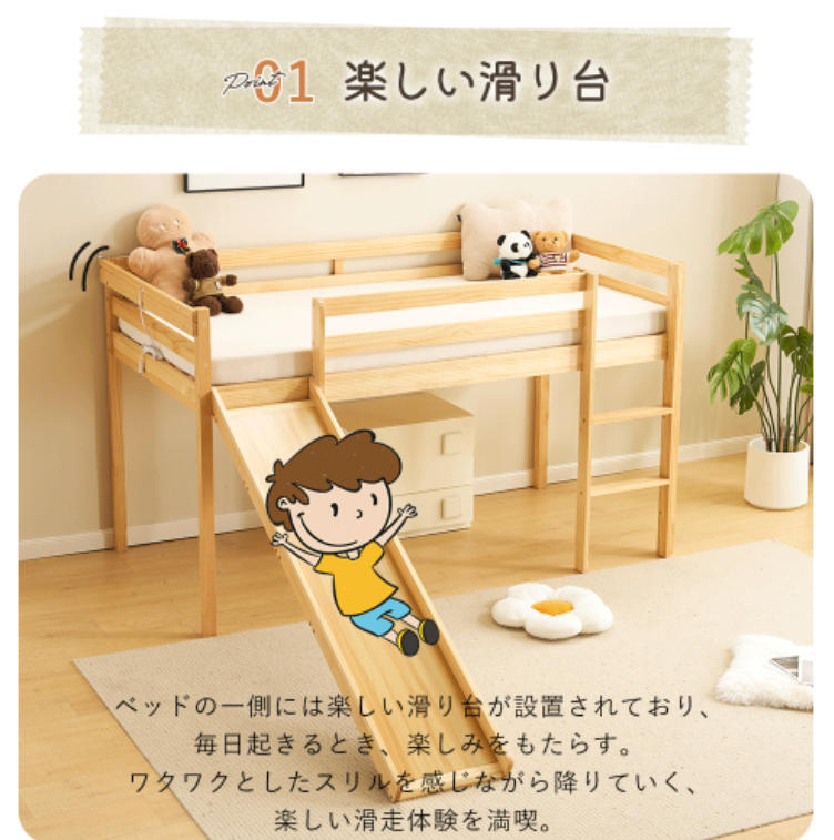 • 【ナチュラルな木材】天然パイン材を使用しています。滑り台とベッドボード以外、天然の松の木(クスノキ)が使われている、長期間の使用に耐える。クスノキは虫の目、木目や節が少ないため、他の木材に比べて安定しています。湿気を吸収・放出する特性があって、通気性に優れています。