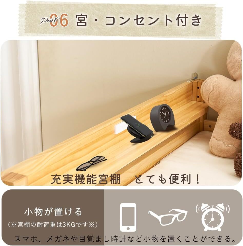 • 【宮・コンセント付き】充実機能宮棚 とても便利! 小物が置ける (*宮棚の耐荷重は3KGです*) スマホ、メガネや目覚まし時計など小物を置くことができる 枕元にコンセントがあり、ベッド上で携帯を充電可能!