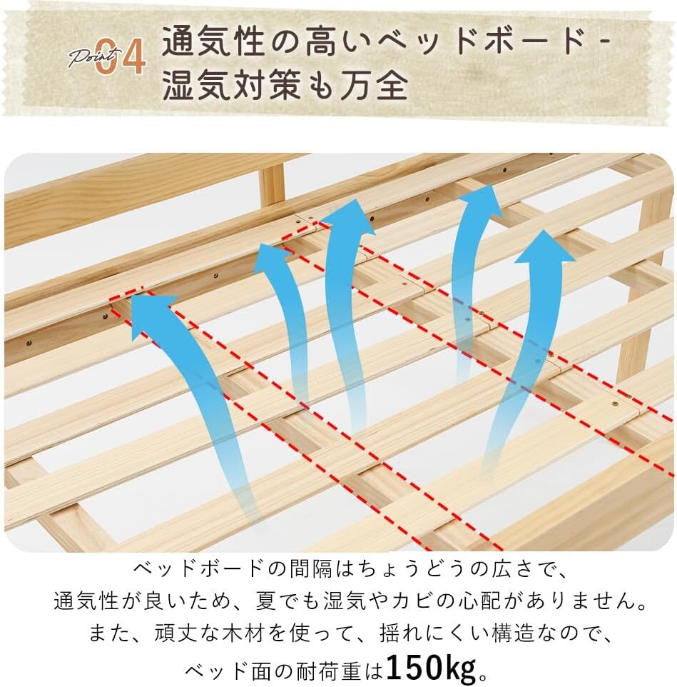 • 【通気性の高いベッドボード - 湿気対策も万全】ベッドボードの間隔はちょうどうの広さで、通気性が良いため、夏でも湿気やカビの心配がありません。 また、頑丈な木材を使って、揺れにくい構造なので、ベッド面の耐荷重は120㎏。