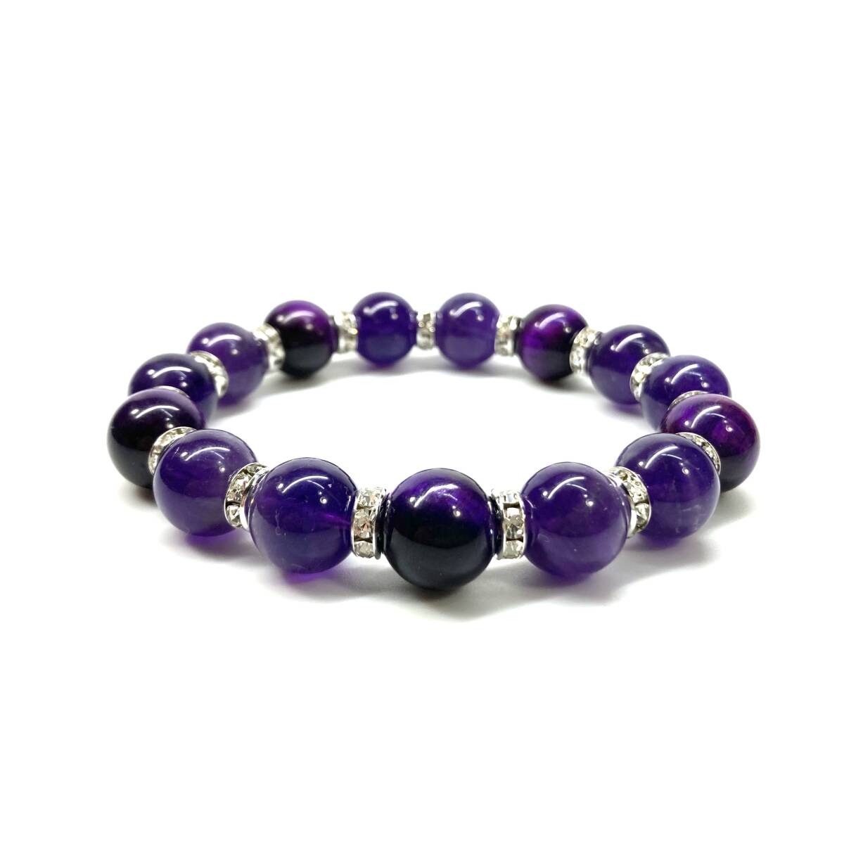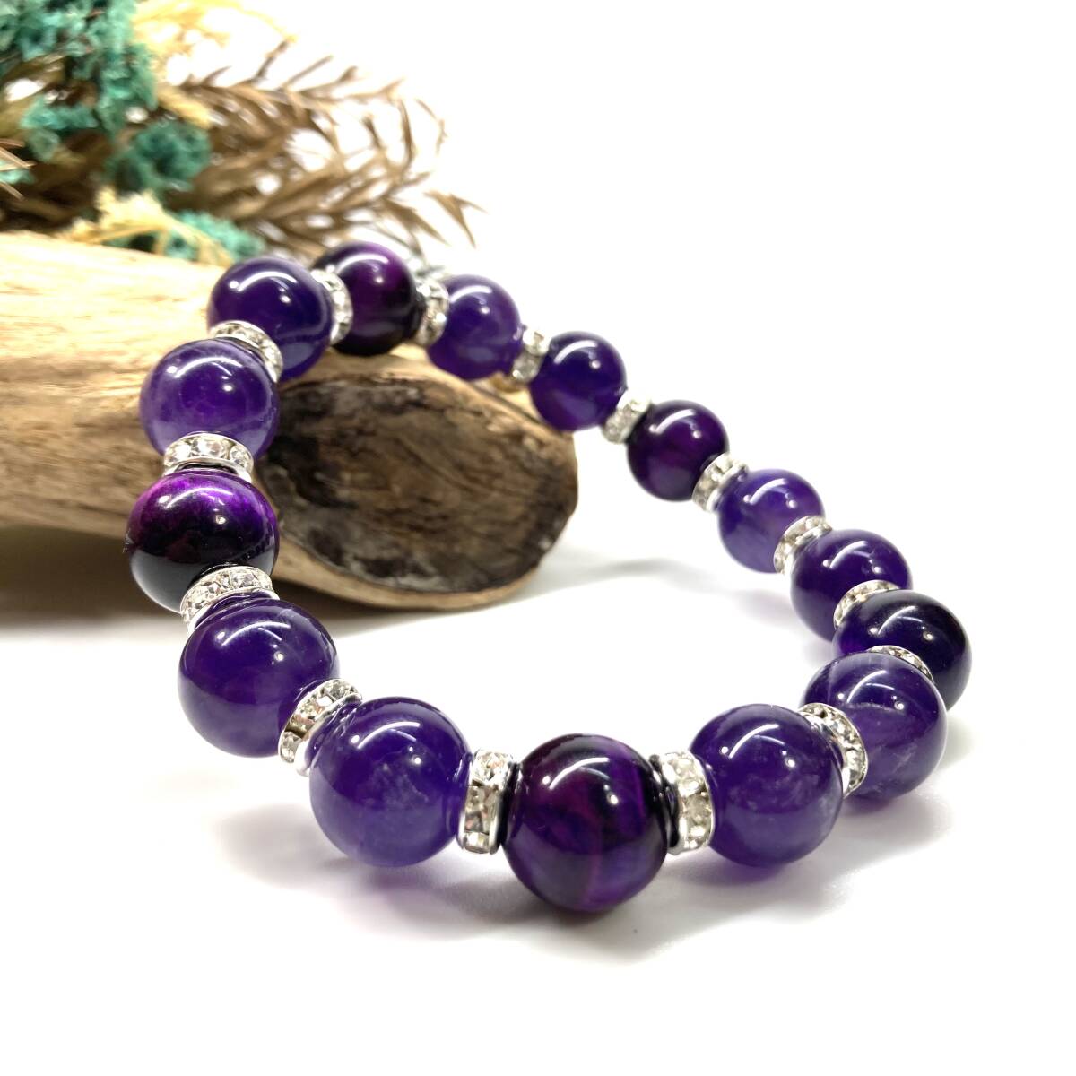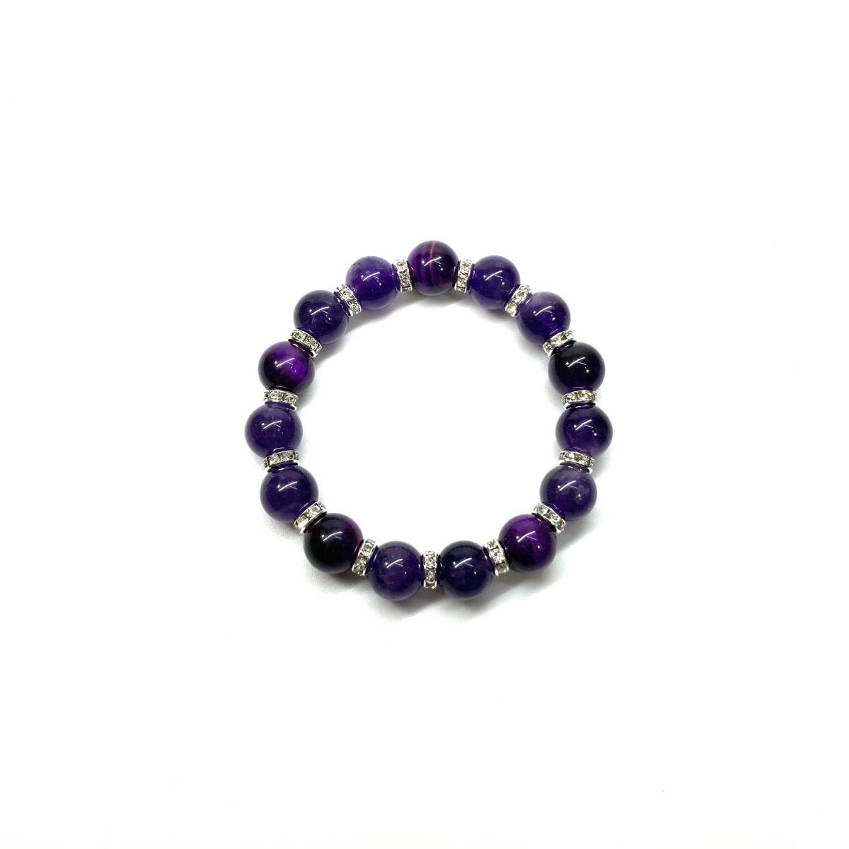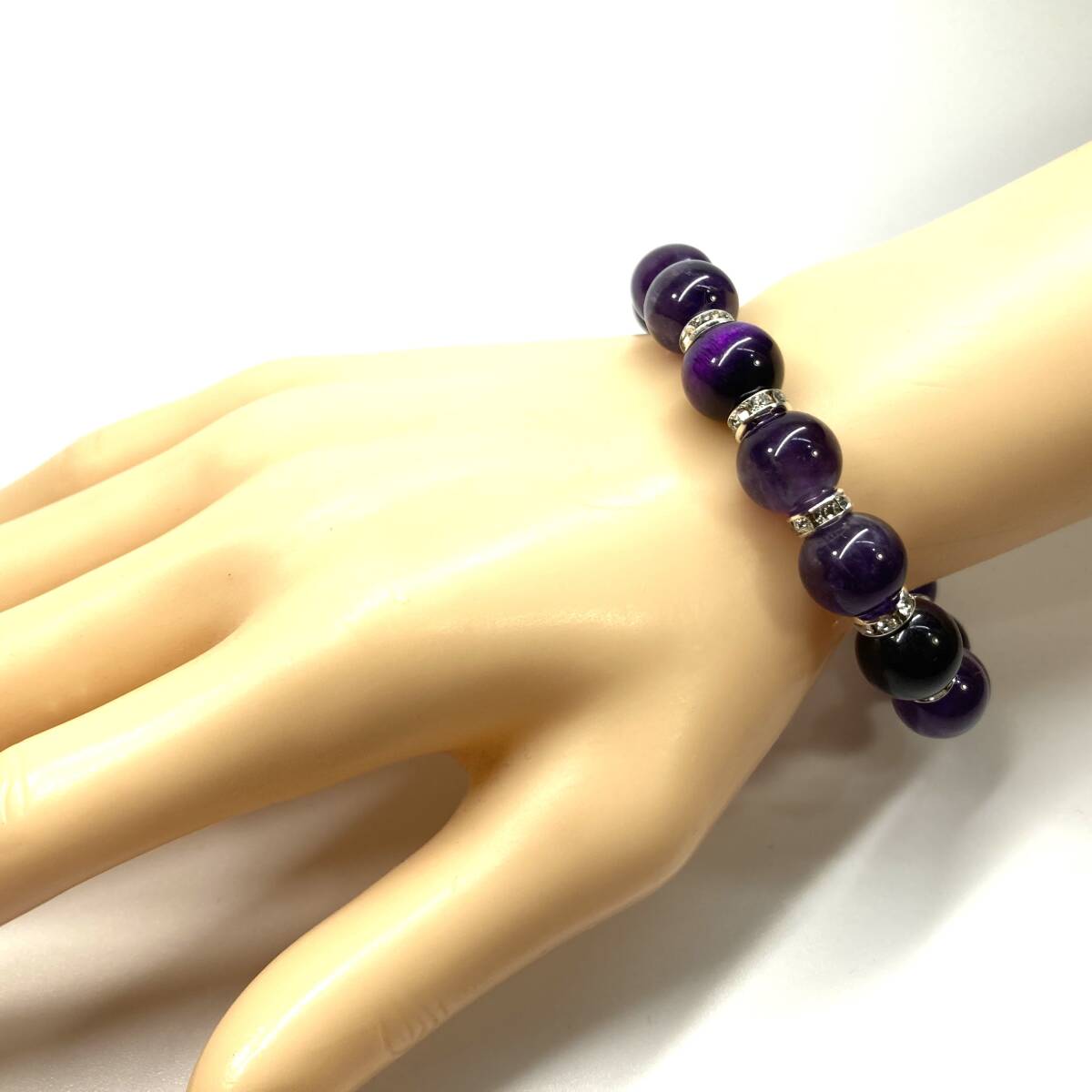 こちらは、パープルタイガーアイとアメジストを組み合わせたパワーストーンブレスレットです。間にはロンデルを挟み高級感あるデザインに仕上げております。石大きさは12mm玉を使用して内周約18cmです。気になる方は是非この機会にどうぞ。
