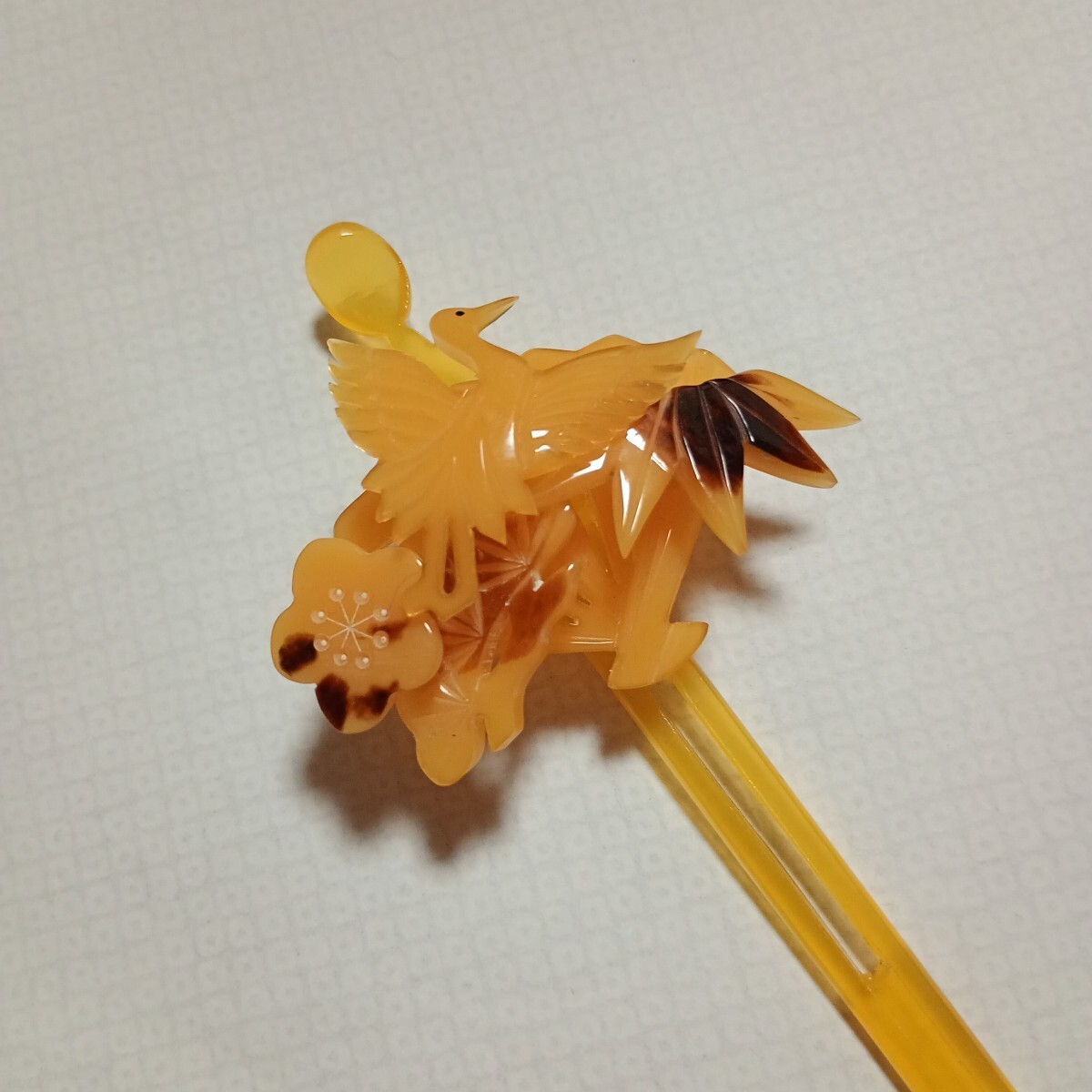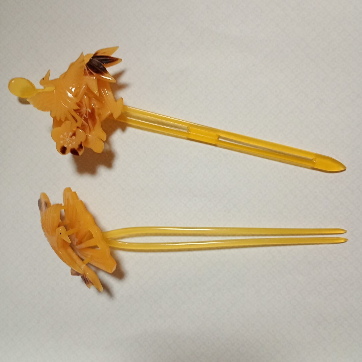 かんざしを二本セットいたしました。19cmと16cmの二本です。松竹梅に扇と鶴です。素材は鼈甲ではありませんので町着にもお楽しみいただけます。