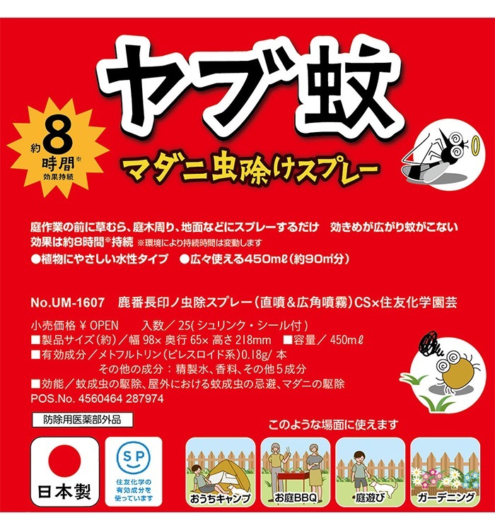 | キャプテンスタッグ×住友化学園芸のコラボモデル。 1.地面にまくだけで、効き目が広がり、ヤブ蚊を寄せ付けない。 2.直接噴射で殺虫も可能。 新しい発想のスプレータイプの虫除け剤。屋外でのキャンプや作業時にお勧めです。 【住友化学園芸】 1969年創業の家庭園芸のリーディングカンパニー。日本を代表する総合化学メーカー住友化学とのシナジーを活かした開発を基本とし、業界をリードする安全で高品質な商品開発を展開しています。 自然・害虫のプロの技術をアウトドアのフィールドでも活かしていきます。 |