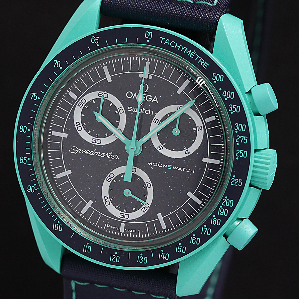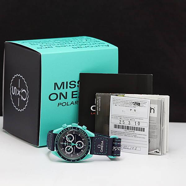 1円 保/箱付 稼働 美品 オメガ×スウォッチ スピードマスター QZ ネイビー文字盤 メンズ腕時計 0079200 9BKT SMZ