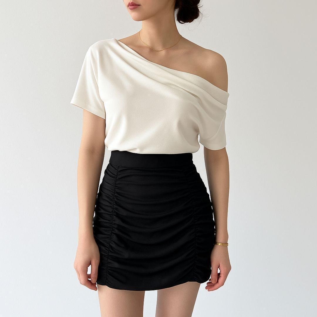 大人の抜け感が出るオフショルダードレープトップと、スタイルアップ見えのシャーリングミニスカートの2点セットです。