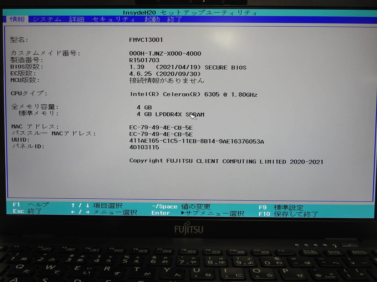 富士通 FUTRO U9311/M CPU:Celeron 6305 メモリ:4GB SSD:128GB(入荷情報より抜粋) (商品状態) 全体的にはキズ、スリキズ、磨耗等あります。 底面、ゴム足欠品しています。 液晶部、スリキズ、キーボード接触痕があります。 通電しBIOSのみ起動確認済みです。 上記理由につきジャンク品として出品します。 付属品 なし ※ジャンク品につき保証対応無し |