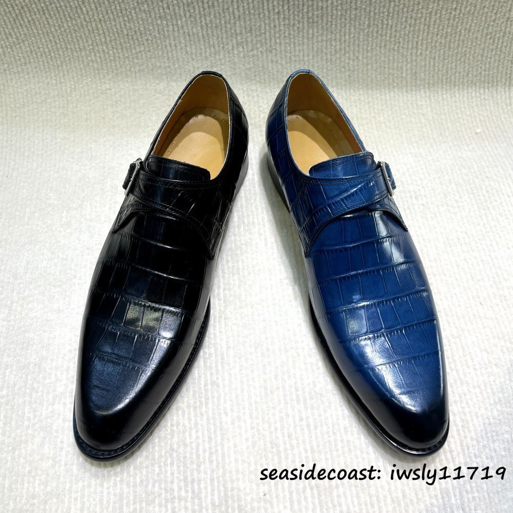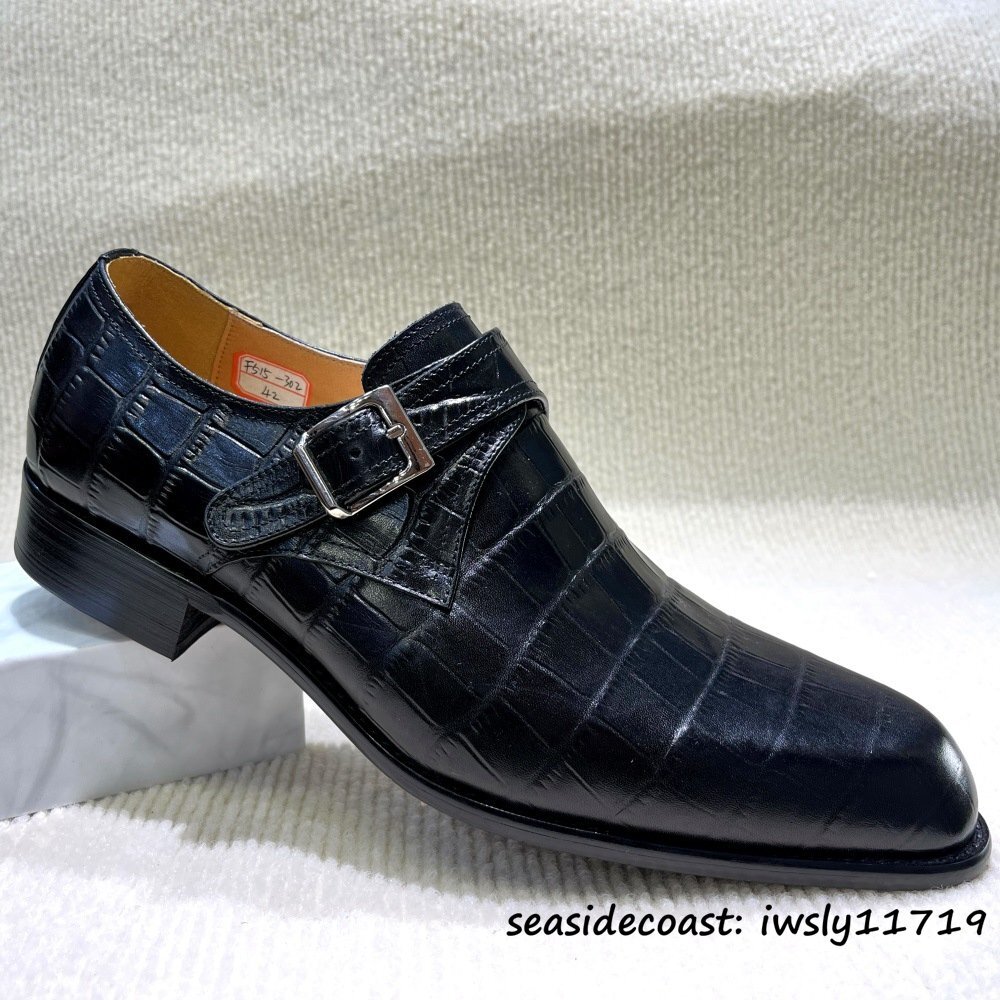 定価11万■モンクストラップ 本革 ビジネスシューズ 職人手塗り上げ 鰐柄 紳士靴 レザーシューズ 牛革革靴 ドレスシューズ ブラック 25.0cm