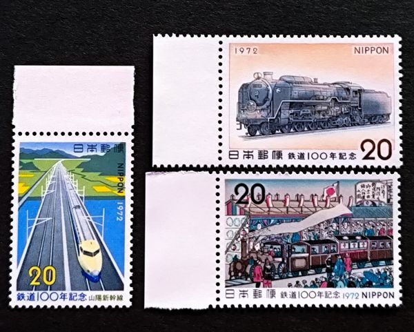 [25091106]【鉄道100年記念】単片3種完「山陽新幹線 蒸気機関車形式C62 鉄道開業の図」20円×3 1972年発行 美品