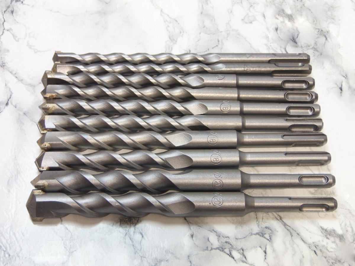 | ◆商品説明◆ | 新品 コンクリートドリル 刃径 12mm 14mm 16mm 18mm 20mm 全長 200mm 各2本ずつ計10本セット 刃先はタングステンカーバイトチップ使用で耐久性、切削スピードがアップします。 コンクリート・ブロック・レンガ・モルタルへの穴あけ作業にご利用ください。 【サイズ&本数】 12×200mm (有効長:約120mm)・・・・2本 14×200mm (有効長:約120mm)・・・・2本 16×200mm (有効長:約120mm)・・・・2本 18×200mm (有効長:約110mm)・・・・2本 20×200mm (有効長:約110mm)・・・・2本 上記合計10本の販売になります。 材質:超耐熱特殊鋼 刃先:タングステンカーバイトチップ シャンク:SDSplus |