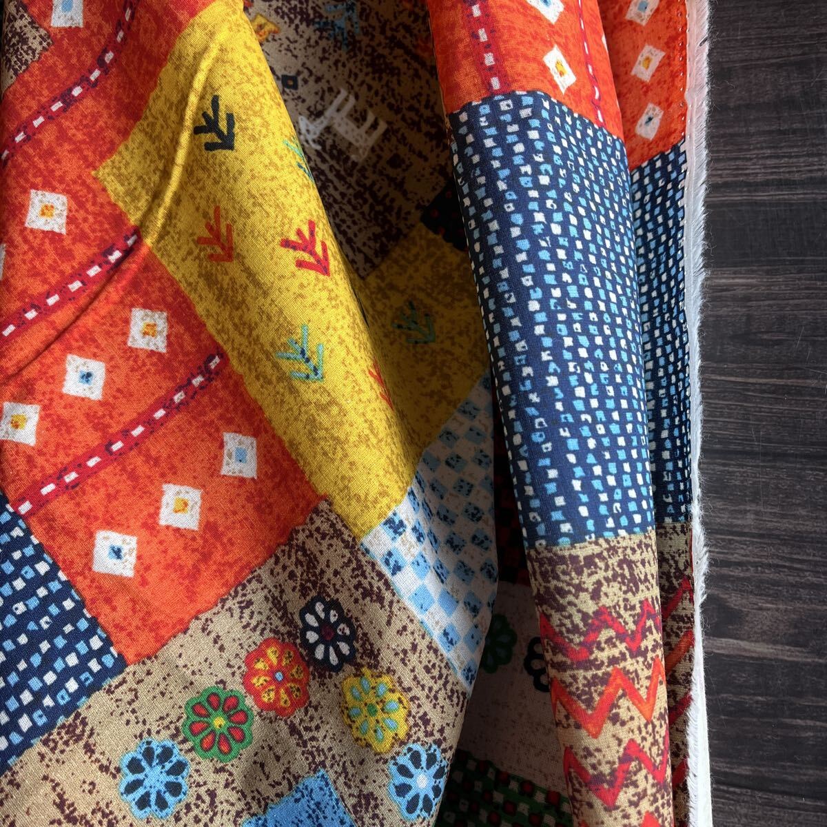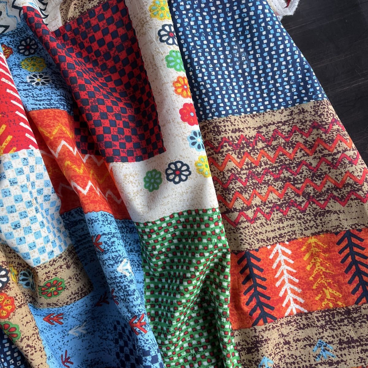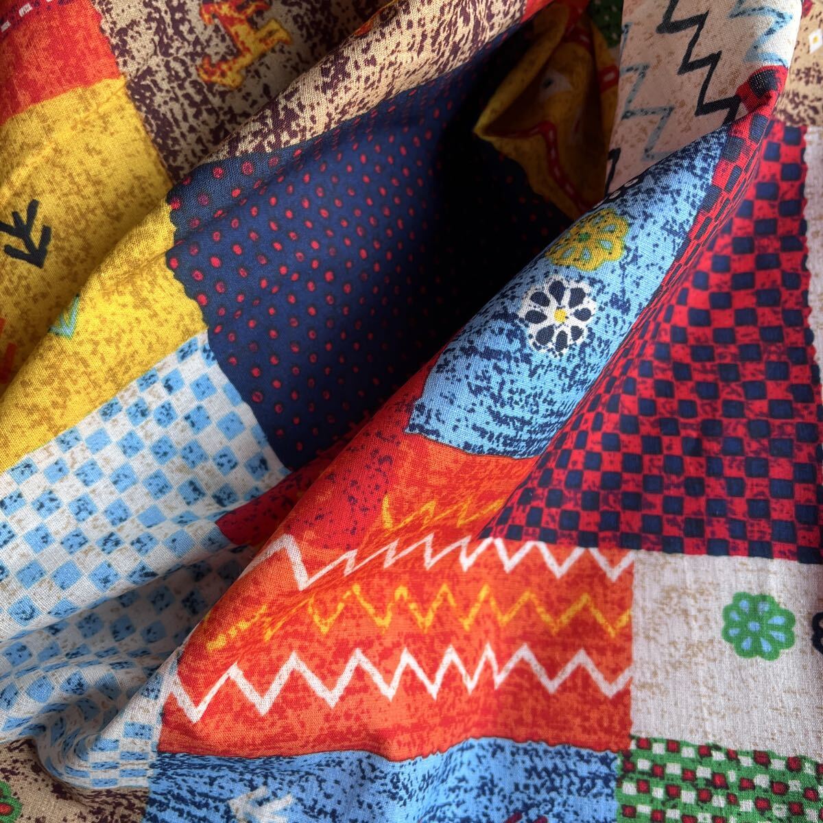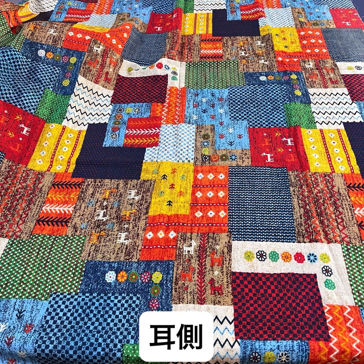 民族調の生地をパッチワークしたような、とってもおしゃれな生地柄です。程よい厚みでお洋服から小物まで幅広くお使えいただけます。