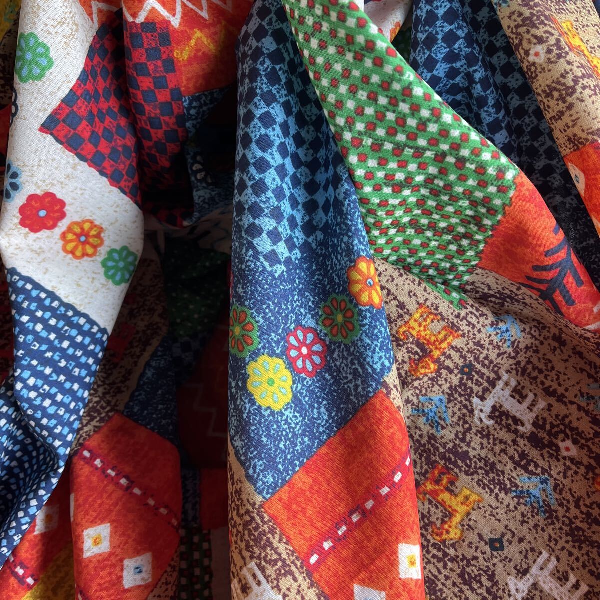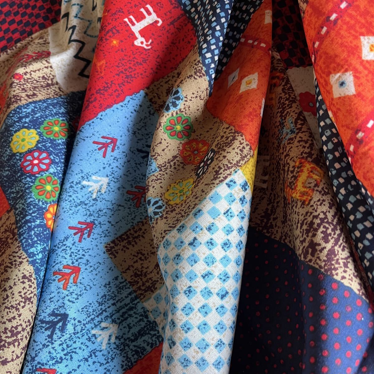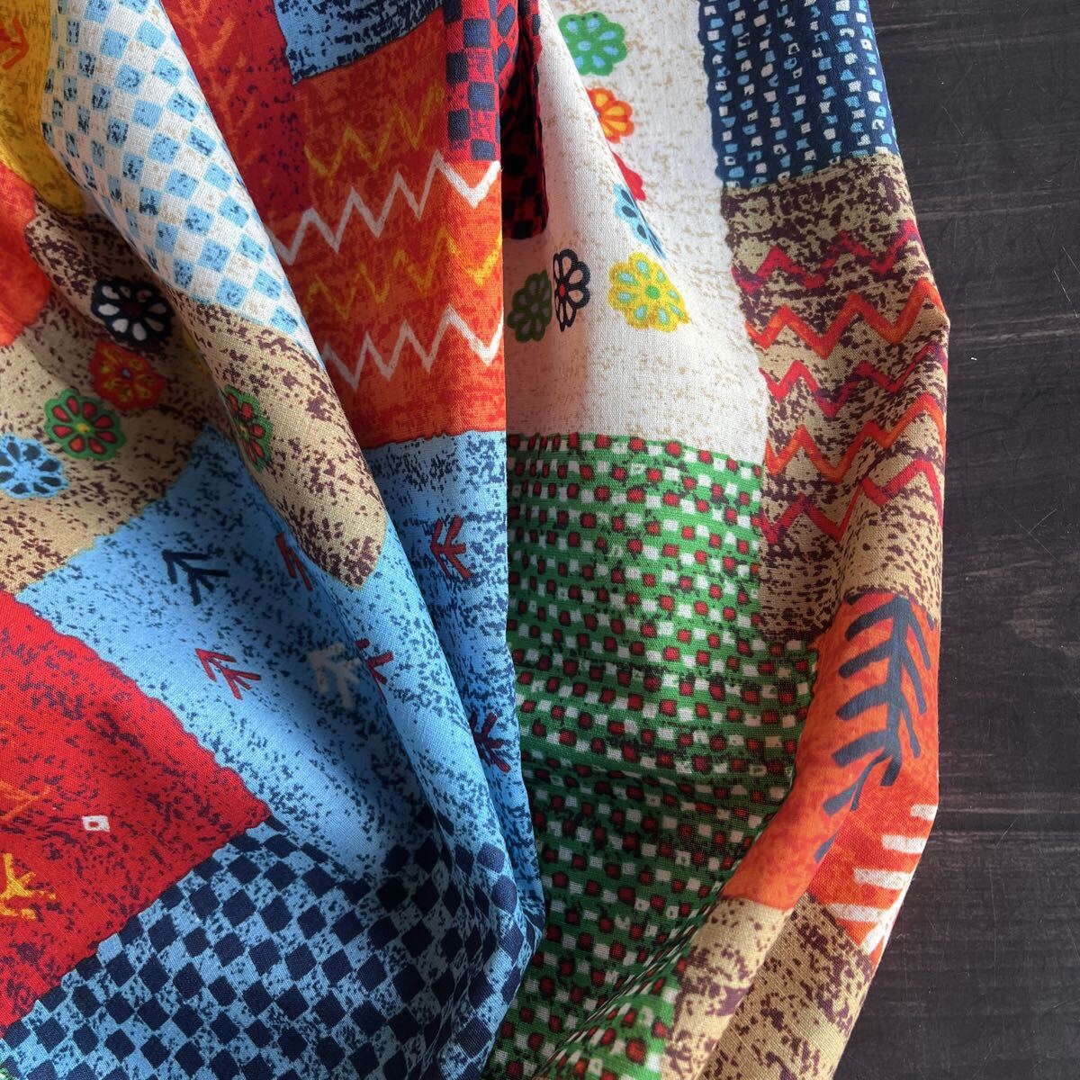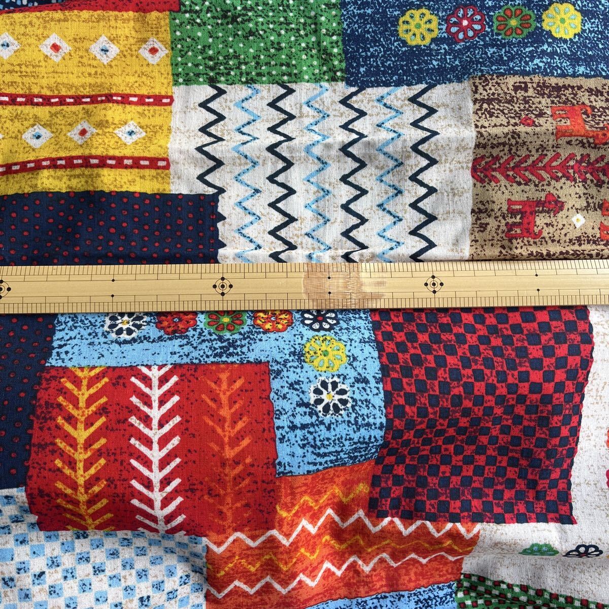 民族調の生地をパッチワークしたような、とってもおしゃれな生地柄です。程よい厚みでお洋服から小物まで幅広くお使えいただけます。