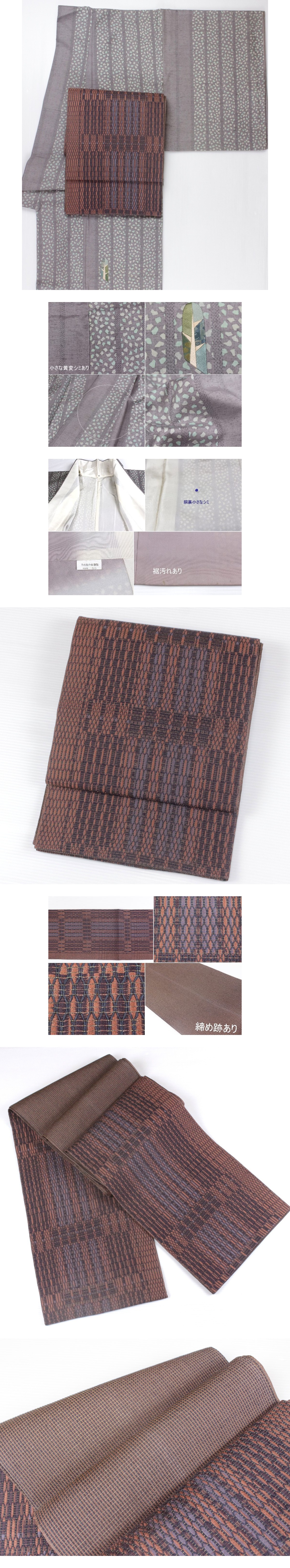 正絹紬附下と正絹袋帯のセット のご紹介です。 落ち着きのある地色に縦縞風の小紋柄が施された紬附下は、さらりとした質感と品のある風合いが魅力です。 程よい格を持ちながらも堅苦しくなりすぎず、観劇や食事会など、幅広い場面でお楽しみいただけます。 合わせる袋帯は、温かみのある茶系と深みのある紫を基調とした幾何学文様。 紬ならではの趣を引き立てつつ、落ち着いた中にもしっかりとした存在感を放ちます。 上質な正絹の質感と洒落味あふれるデザインが響き合うコーディネート。季節を問わず、知的でセンスの光る装いをお楽しみください。 ※撮影時の部屋の照明によって画像の色に若干の差がございます。色味に差がございますことをご了承のうえご検討下さいませ。 …状態… 着物:裾に汚れ。所々にシミあり。 帯:締め跡あり。 ※全くの新品ではございませんので、記載のない変色やスレ、ヤケ、その他僅かな難がある場合がございます。そのような理由でのキャンセルはお受けできませんので、ご了承の上ご検討お願いいたします。 |