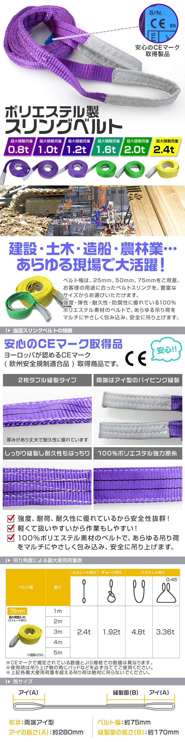 | 基本使用荷重2400kg(ストレート吊)/ 4800kg(バスケット吊)の荷役吊り上げベルトです。 ◎強度、耐荷、耐久性に優れているから安全性抜群 ◎軽いので扱いやすい ◎ヨーロッパが認めるCEマーク(欧州安全規制適合品) 取得商品 ◎ポリエステル100% ◎両端アイタイプ 運送業・自動車産業・建設業・倉庫業・造園業・港湾業・造船業・林業・石材業・荷役業など様々な作業にお使いください。 【仕様】 ベルトサイズ:長さ4m×幅75mm 材質:ポリエステル100% 最大使用荷重(能力):ストレート吊2400kg、チョーク吊1920kg、バスケット吊4800kg CE規格品 【内容】 ナイロンスリングベルト(耐荷2.4t 75mm×4m) ×10本 (スリングベルト ナイロンスリング ベルトスリング ナイロンスリングベルト 吊りベルト 吊り帯ベルト 荷吊りベルト 荷揚げ 荷締め ロープ 牽引 クレーンロープ クレーンベルト 運搬 おすすめ 送料無料) ※こちらの商品は元々伸縮性がある為、個体差がございまして長さに若干違いが生じることがございますが 返品交換の対象にはなりませんので、予めご了承ください。 |
