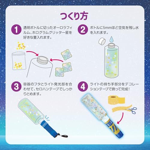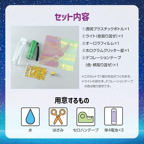 セット内容:透明プラスチックボトル×1、ライト(色取り混ぜ)×1、ホログラムグリッター星×1、デコレーションテープ(色・柄取り混ぜ)×1、オーロラフィルム×1