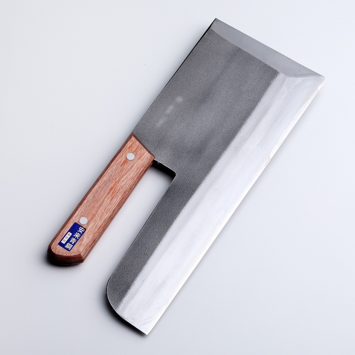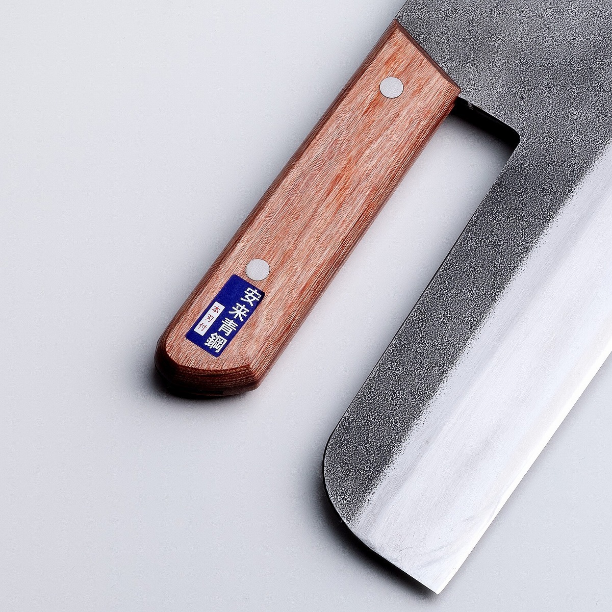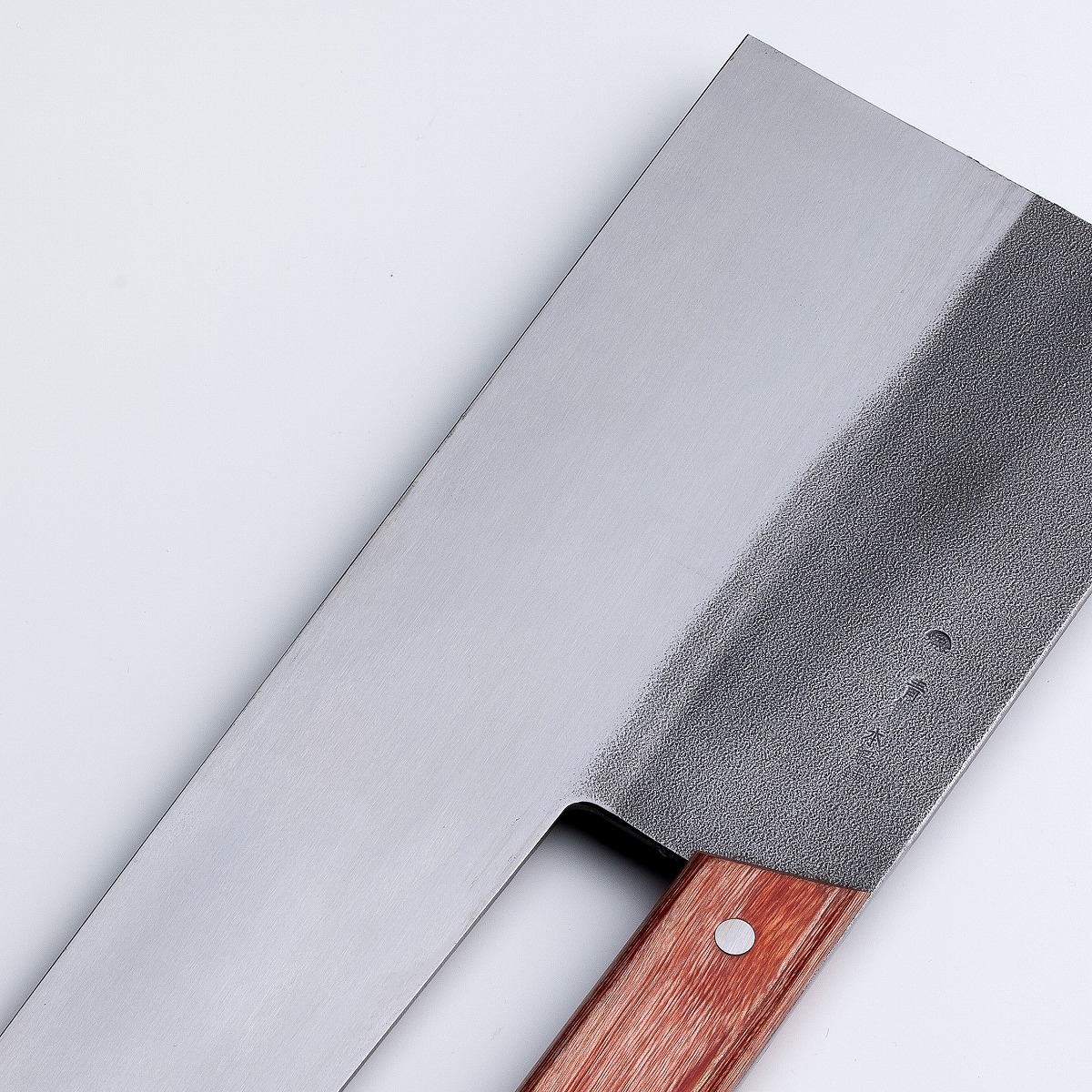高級刃物鋼の青紙鋼を鋼に使用し、職人が本刃付した切れ味の良い麺切包丁です。