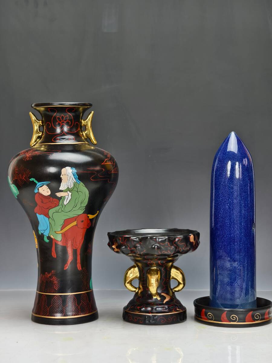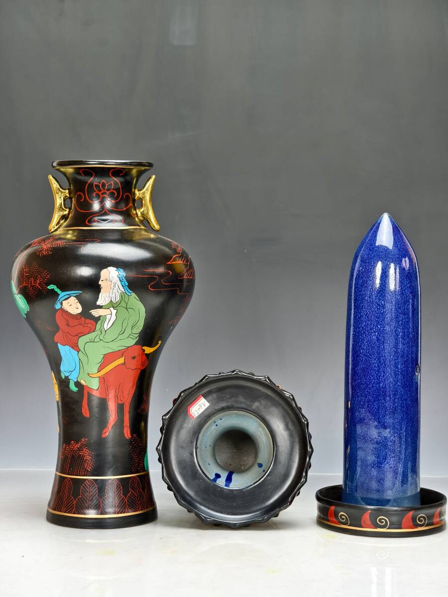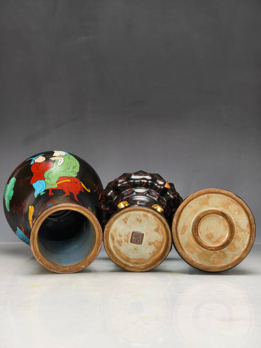 中国磁器 人間国宝 中国古董 [天青如磁「黒釉漆彩」回転花瓶【インボイス登録済】工品、釉面陶器、陶瓷、雕像、手工品、孤品