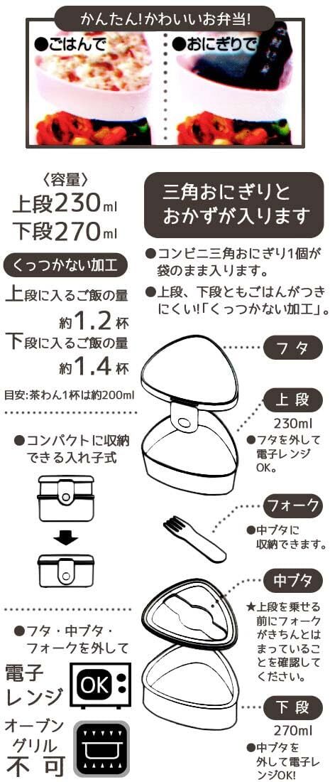 抗菌剤練り込み加工おにぎりケース コンビニの三角おにぎり1個が袋のまますっぽり入る 上段下段とも、ごはんがつきにくい「くっつかない加工」 内蓋収納フォーク(プラスチック製)付き フタ・中ブタ・フォークを外して電子レンジOK ロック式ですが、パッキンは付いていませんので汁気のある食材はお避け下さい 自動食器洗浄機・食器乾燥機の使用は不可