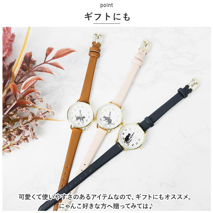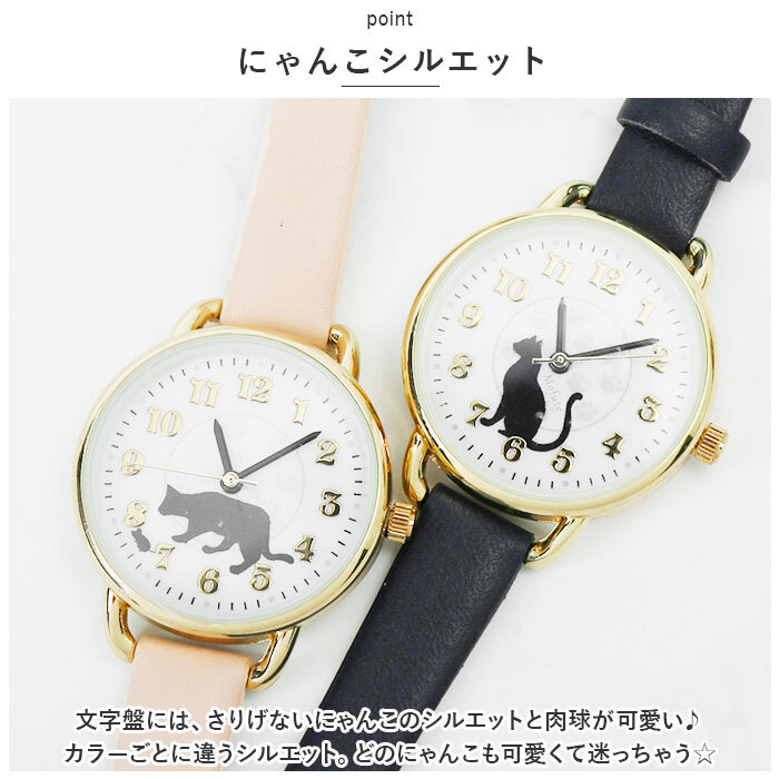 | 商品説明 | ・・にゃんこのシルエット×肉球が可愛い♪ベーシックな腕時計が登場。 ・【にゃんこシルエット】 ・文字盤には、さりげないにゃんこのシルエットと肉球が可愛い♪カラーごとに違うシルエット。どのにゃんこも可愛くて迷っちゃう☆ ・【ベーシック】 ・ベルト×アナログ時計のベーシックな作り。子供から大人まで、幅広いシーンで使用できる。 ・【ゴールド仕立て】 ・金属部分はゴールド仕立て。にゃんこデザインでもしっかり大人っぽい、上品な雰囲気。 ・【ギフトにも】 ・可愛くて使いやすさのあるアイテムなので、ギフトにもオススメ。にゃんこ好きな方へ贈ってみては♪ |