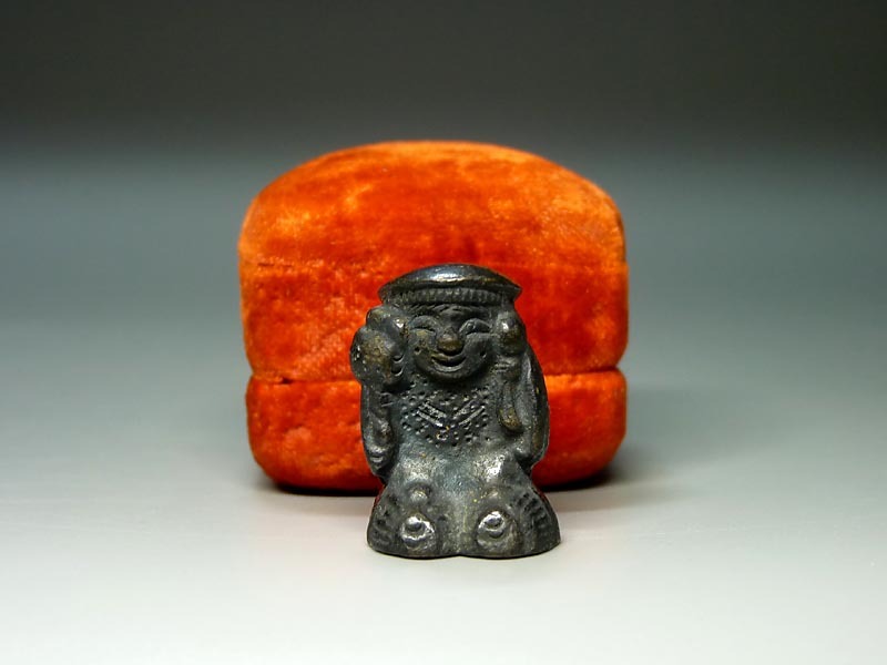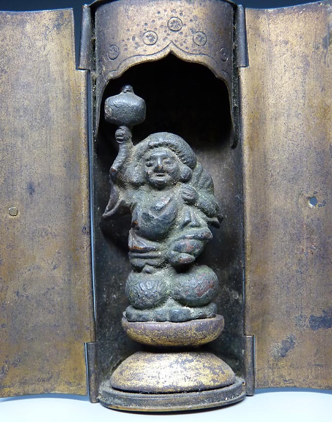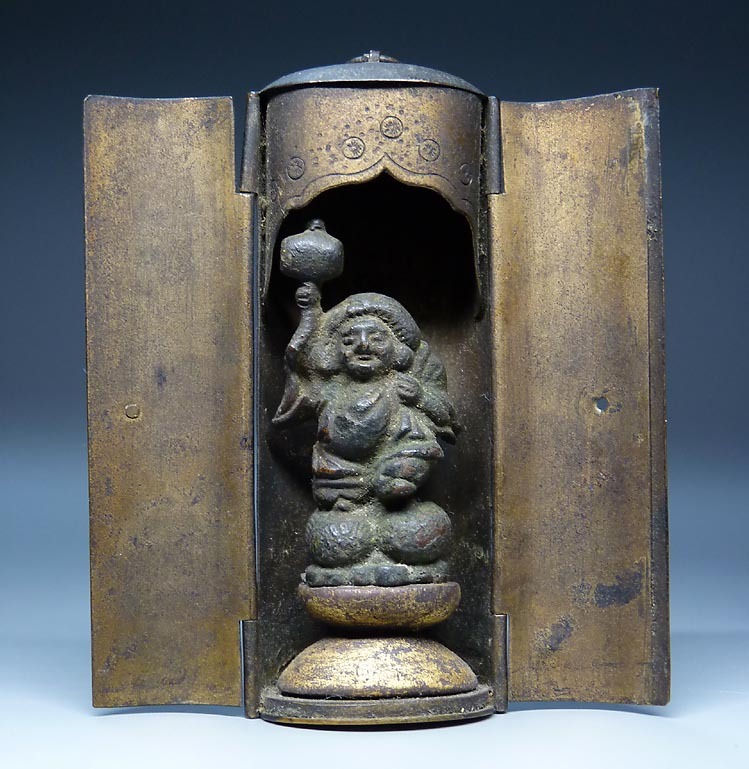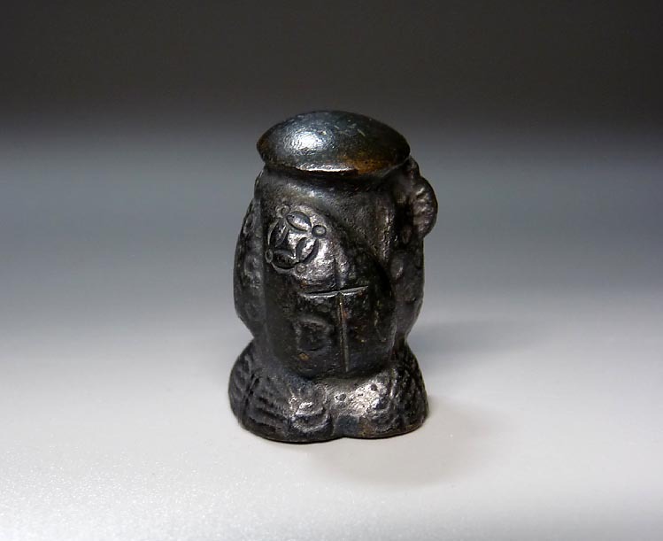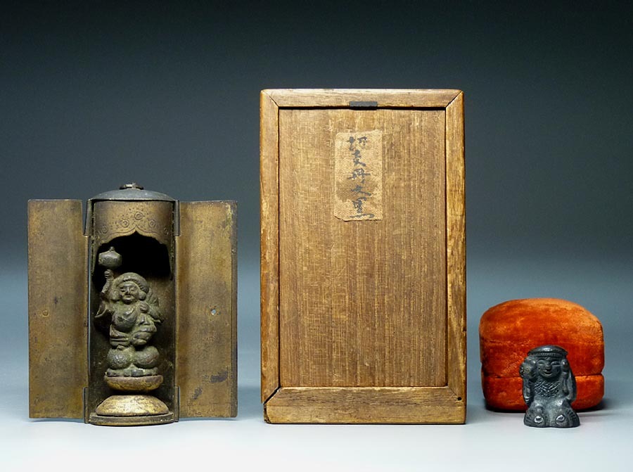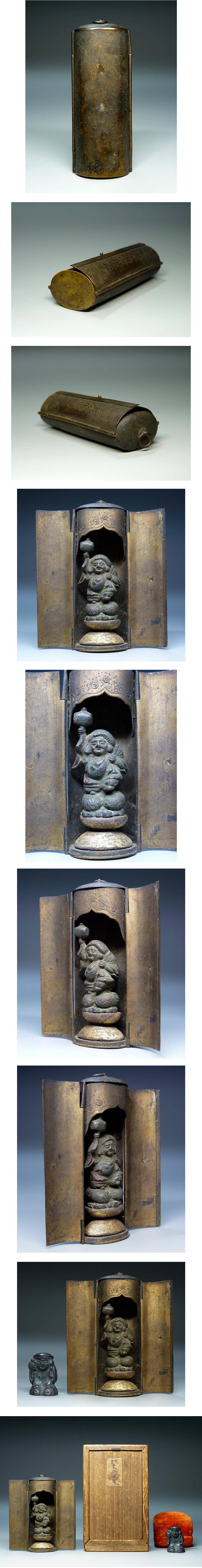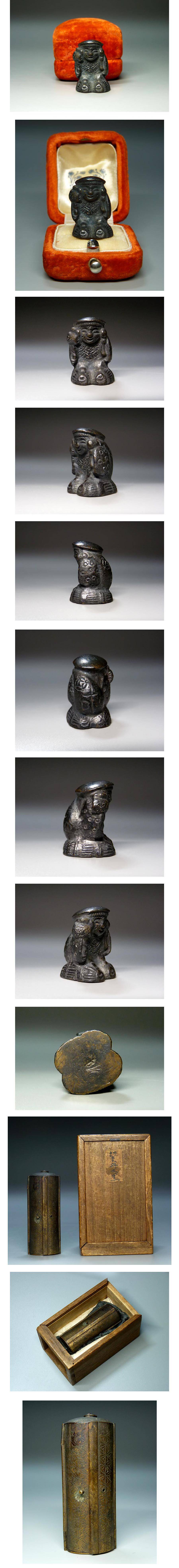 【夢たま】郷土史家の収集品!重要資料 貴重品 隠れキリシタン遺物 鋳造製 豆大黒天 厨子入り大黒天像/切支丹☆ サイズ・豆大黒天 高さ約2.55㎝。幅約1.8㎝。奥行約1.85㎝。重さ約36g。 厨子入り大黒天。厨子を入れて高さ約7.8㎝。幅約3.1㎝。奥行約2㎝。重さ約75g。両方ともに厨子も入れて鋳造製です。 【商品説明】:詳細は申し上げることはできないのですが、某県において長年文化財保護委員であり、 郷土史家の方が、収集コレクションされていた隠れキリシタン遺物の品です。長年数多くの貴重な品や 資料などを収集コレクションをされていましたが、諸事情によりその大半を寄贈売却となったのですが、 これらの隠れキリシタン遺物10点だけはその手を離れることなく、コレクションされ続けた品々です。 世界文化遺産「長崎と天草地方の潜伏キリシタン関連遺産」の一つの資料として引き継いで頂けたらとの思いから、 処分と言う流れとなりました。またこれらの隠れキリシタン遺物の内容が大変貴重かつ優品であることから これらの説明が、虚偽ではないことがご理解いただけると思います。 文化2年の天草崩れ調書によると信心具として大黒天像などを信仰していた事が判明している。幕府役人による 没収破壊を免れる為に、大黒天像の中に僅かなキリシタン信仰の形をとどめそれを篤信する。この豆大黒天ほど 小さな隠れキリシタン置物を見たことがない。後ろ側の背の袋に十字の陰刻があります。 もう一つの厨子入り大黒天像も一見何の変哲もない小さな大黒天の様にも見えますが、実は小槌が横を向いていて、 また握る柄も不自然に長い。これは小槌を十字架に見立てて信仰していたのであります。どちらも鋳造製である事は もちろん大変珍しい信仰対象の大黒天像の2体です。 【状態】:経年による汚れあり、スレがあり、厨子の扉の金具の欠損がありますが、大きな傷みなどもなく、 状態は良好と言えます。時代経過による前記傷みはご了承ください。 |