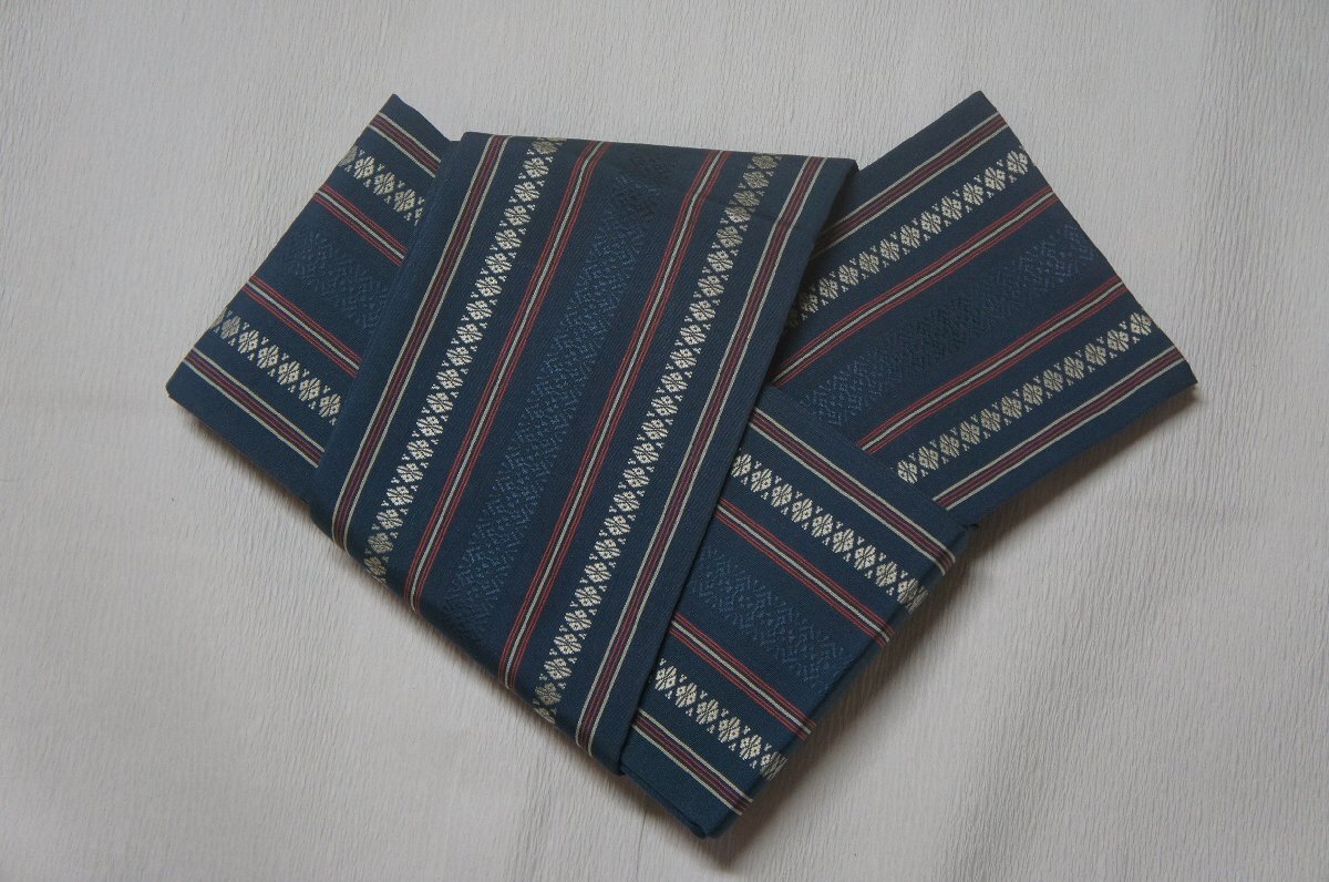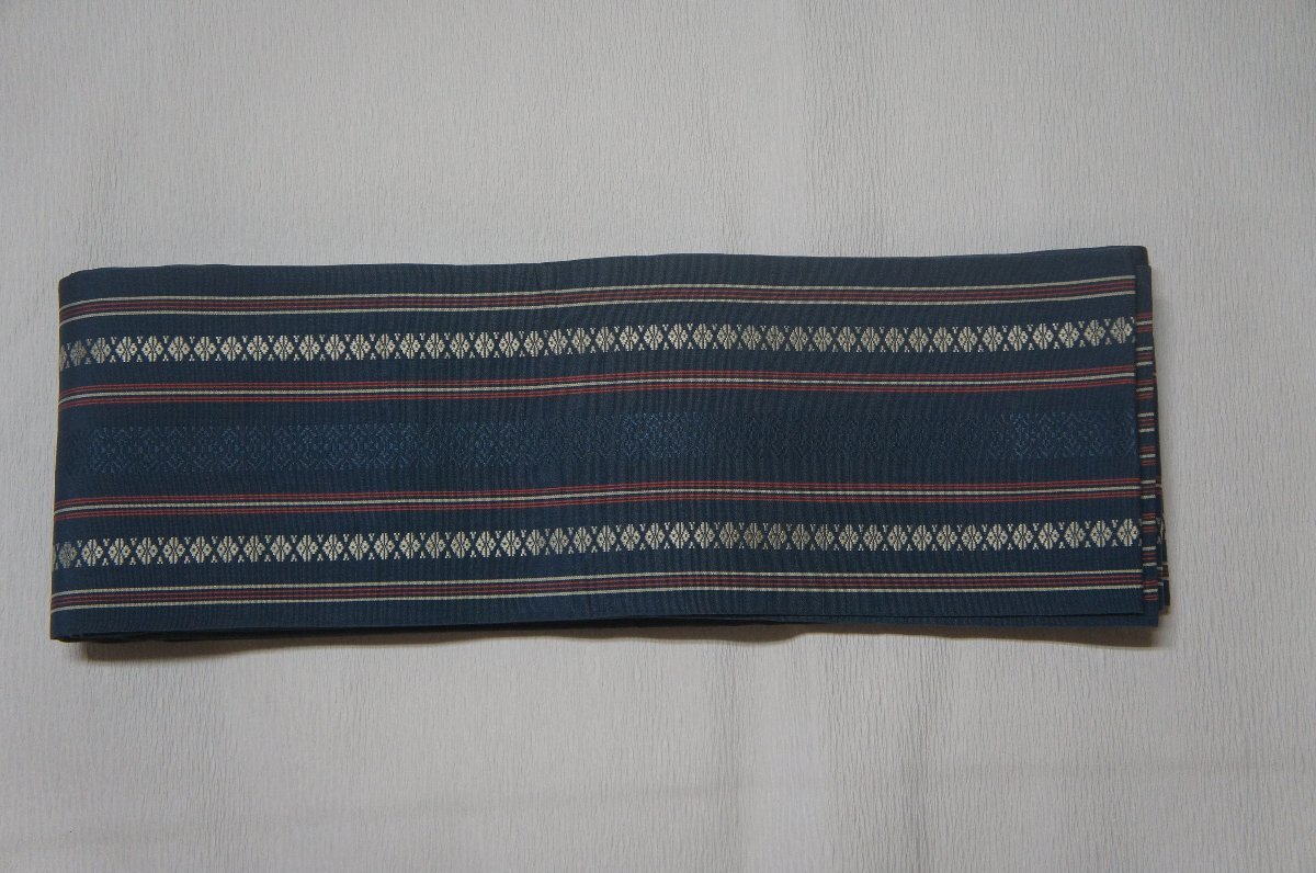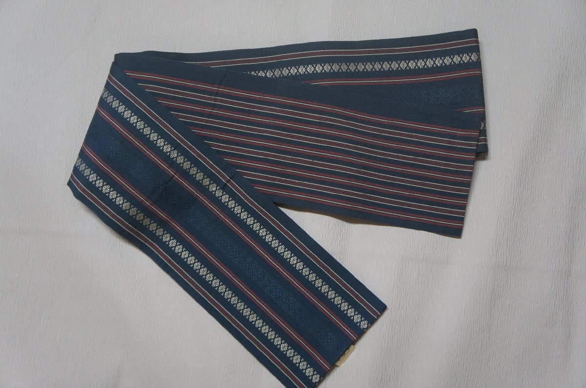商品名半巾帯正絹本筑博多織深藍色地献上模様縞模様小袋吉弥帯[N16466]