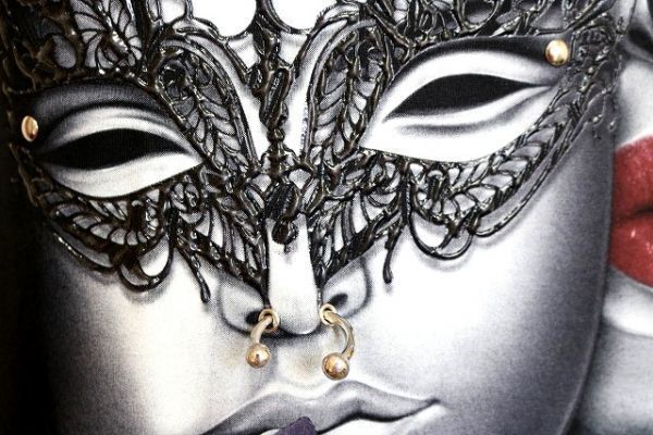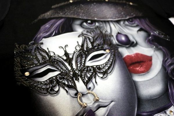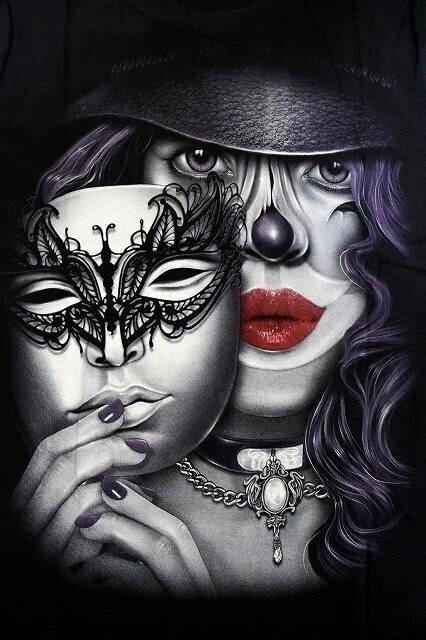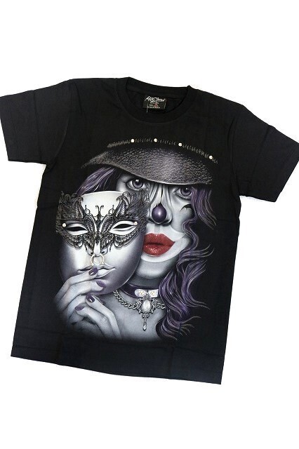 デザイン内の仮面の鼻の部分等に金属が使用されているとてもおしゃれで珍しいTシャツです。